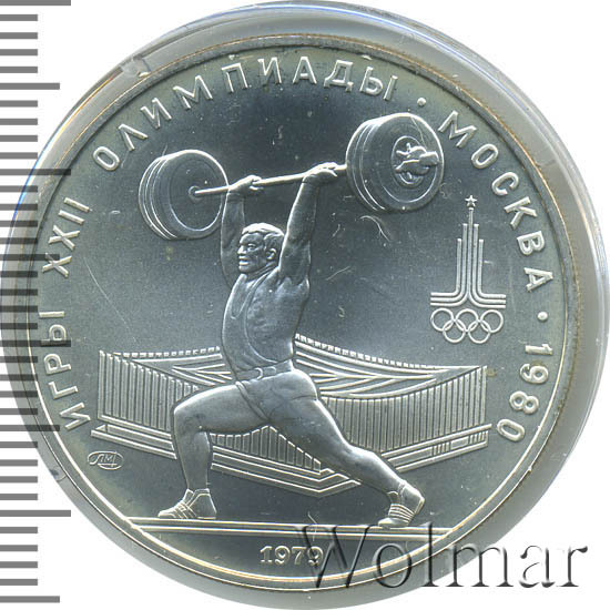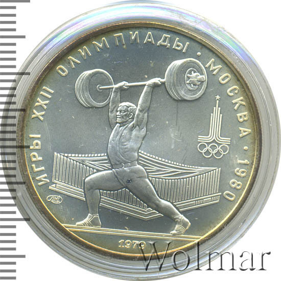 Слева и сверху вдоль канта слова «ИГРЫ XXII ОЛИМПИАДЫ», справа разделенные точкой слово «МОСКВА» и год проведения XXII Олимпиады «1980», в середине атлет, поднимающий штангу, за ним спортивный зал тяжелой атлетики, справа эмблема XXII Олимпийских игр, слева монограмма монетного двора «ММД», внизу у канта год выпуска монеты «1979».
