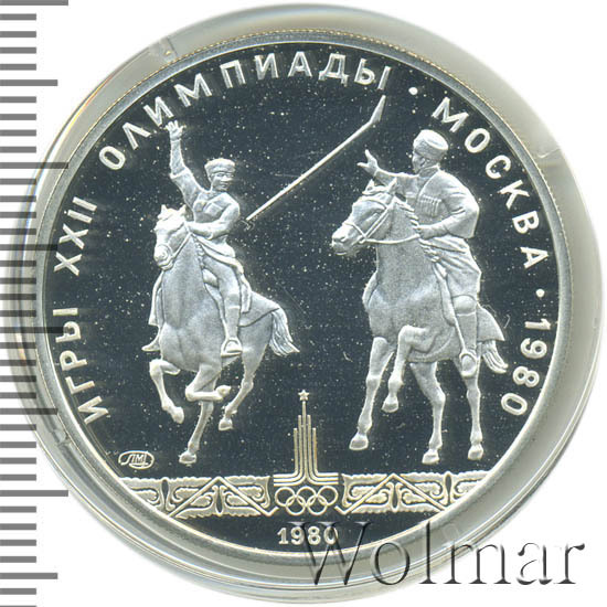 Слева и сверху вдоль канта слова «ИГРЫ XXII ОЛИМПИАДЫ», справа разделенные точкой слово «МОСКВА» и год проведения XXII Олимпиады «1980», в середине два всадника демонстрируют элемент игры исинди, внизу слева монограмма монетного двора «ЛМД», в середине эмблема XXII Олимпийских игр, внизу у канта год выпуска монеты «1980».