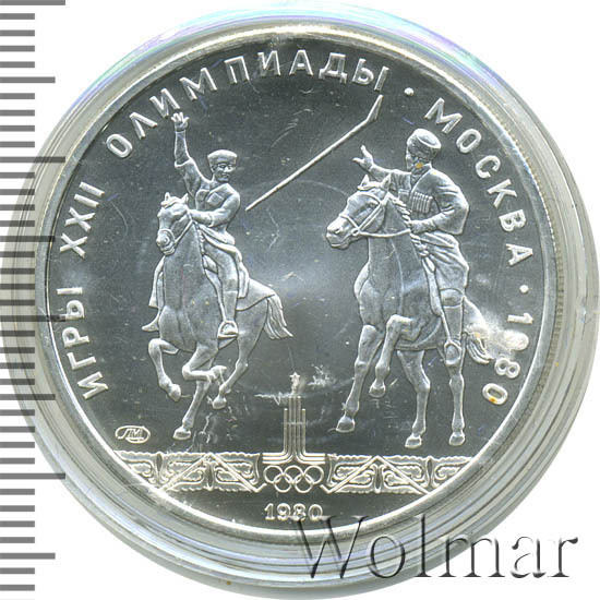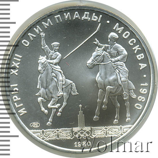 Слева и сверху вдоль канта слова «ИГРЫ XXII ОЛИМПИАДЫ», справа разделенные точкой слово «МОСКВА» и год проведения XXII Олимпиады «1980», в середине два всадника демонстрируют элемент игры исинди, внизу слева монограмма монетного двора «ЛМД», в середине эмблема XXII Олимпийских игр, внизу у канта год выпуска монеты «1980».