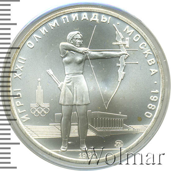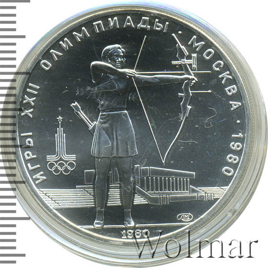Слева и сверху вдоль канта слова «ИГРЫ XXII ОЛИМПИАДЫ», справа разделенные точкой слово «МОСКВА» и год проведения XXII Олимпиады «1980», в середине лучница, стреляющая из лука, за ней спортивное сооружение, слева эмблема XXII Олимпийских игр, справа внизу монограмма монетного двора «ММД», внизу у канта год выпуска монеты «1980».