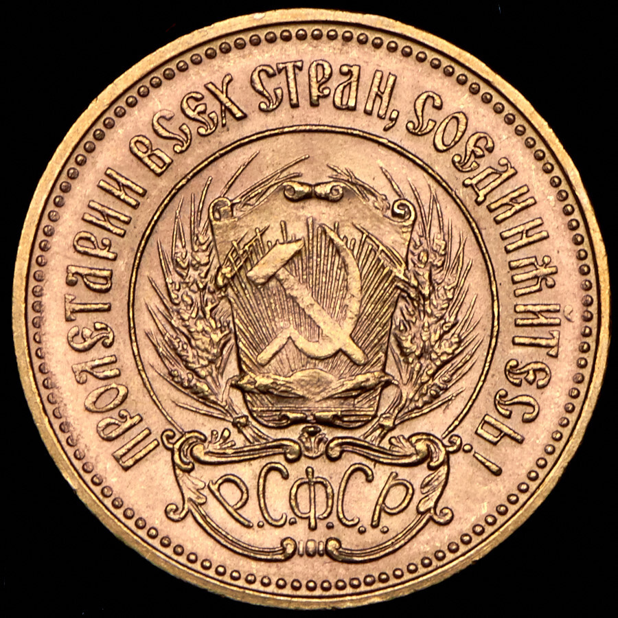 Герб РСФСР, окруженный венком из колосьев, и щит с изображением на нем серпа и молота на фоне солнечных лучей; по краю монеты точки вдоль них надписи: сверху - «ПРОЛЕТАРИИ ВСЕХ СТРАН, СОЕДИНЯЙТЕСЬ!», внизу под гербом - «Р. С. Ф. С. Р.».