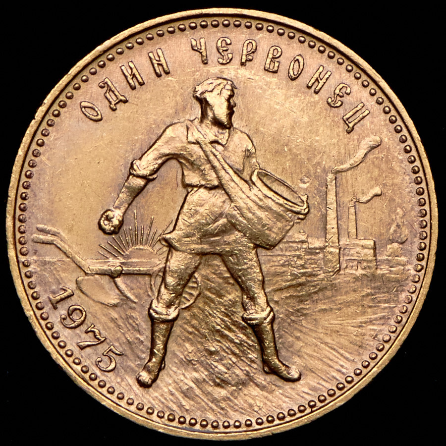 Изображение крестьянина-сеятеля на фоне плуга, восходящего солнца и заводов; по краю монеты точки, вверху надпись - «ОДИН ЧЕРВОНЕЦ», внизу слева — год выпуска - 1975.