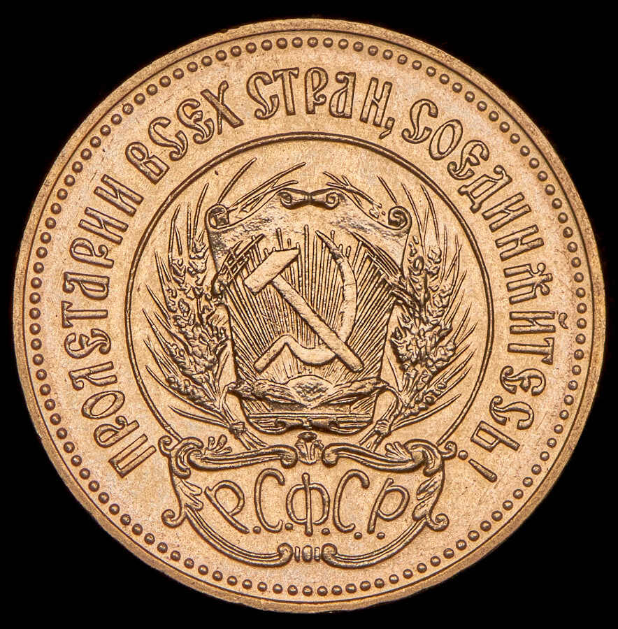 Герб РСФСР, окруженный венком из колосьев, и щит с изображением на нем серпа и молота на фоне солнечных лучей; по краю монеты точки вдоль них надписи: сверху - «ПРОЛЕТАРИИ ВСЕХ СТРАН, СОЕДИНЯЙТЕСЬ!», внизу под гербом - «Р. С. Ф. С. Р.».