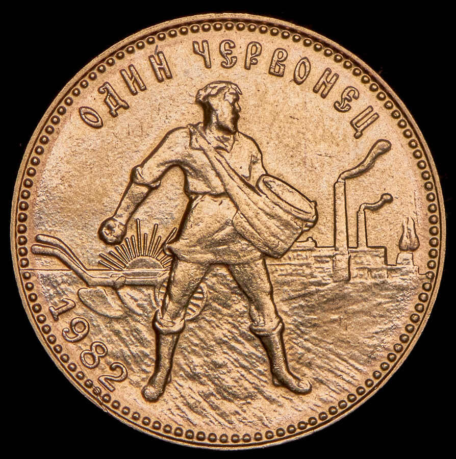 Изображение крестьянина-сеятеля на фоне плуга, восходящего солнца и заводов; по краю монеты точки, вверху надпись - «ОДИН ЧЕРВОНЕЦ», внизу слева — год выпуска - 1982.