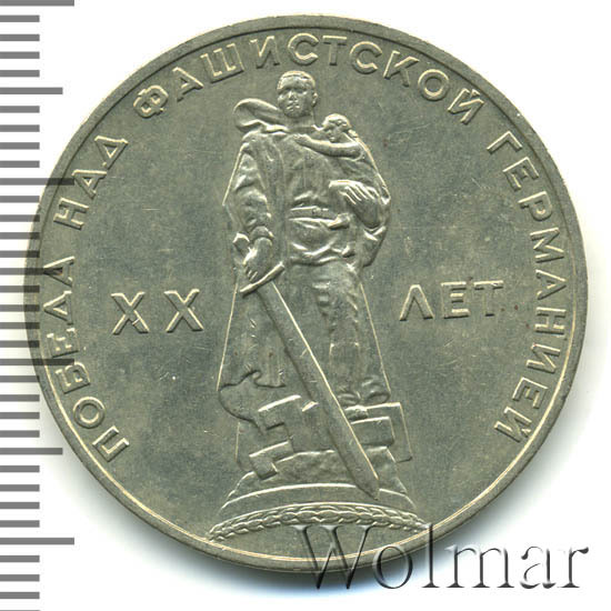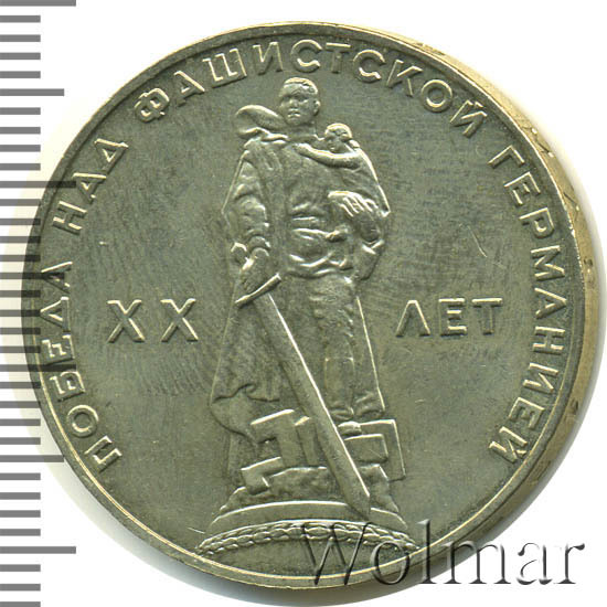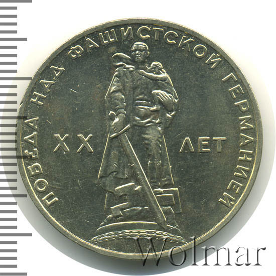 Слева, сверху и справа вдоль края монеты надпись «ПОБЕДА НАД ФАШИСТСКОЙ ГЕРМАНИЕЙ», в середине установленный в Берлине памятник воину-освободителю скульптора Е.В. Вучетича. Слева от памятника латинская цифра «XX», справа слово «ЛЕТ».