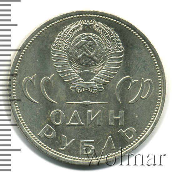 Сверху герб СССР с 15 витками ленты, ниже слева буквы «СС», справа «СР», между ними линия по середине которой горизонтально расположен ромб, еще ниже слово «ОДИН» и внизу вдоль канта слово «РУБЛЬ». Вдоль выступающего канта монеты точечный ободок.