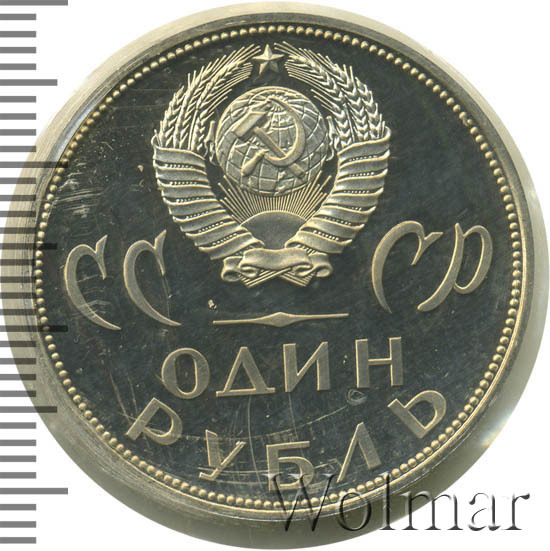 Сверху герб СССР с 15 витками ленты, ниже слева буквы «СС», справа «СР», между ними линия по середине которой горизонтально расположен ромб, еще ниже слово «ОДИН» и внизу вдоль канта слово «РУБЛЬ». Вдоль выступающего канта монеты точечный ободок.