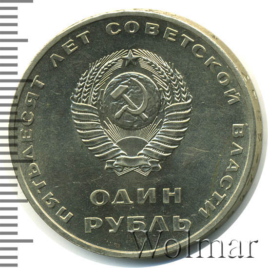 Сверху вдоль края монеты слова «ПЯТЬДЕСЯТ ЛЕТ СОВЕТСКОЙ ВЛАСТИ», в центре герб СССР с 15 витками ленты, под ним обозначение достоинства монеты «ОДИН» и ниже слово «РУБЛЬ».