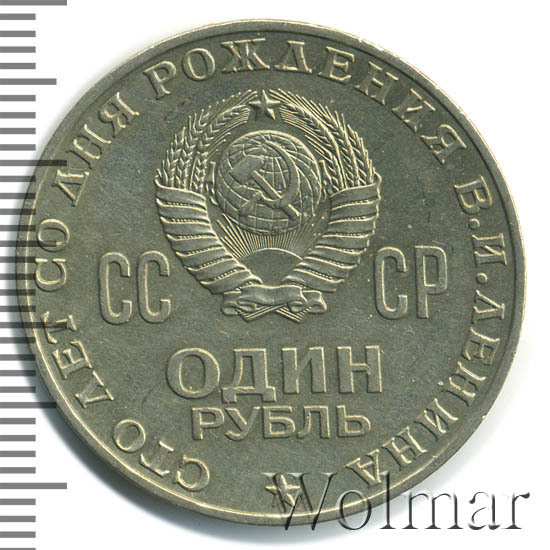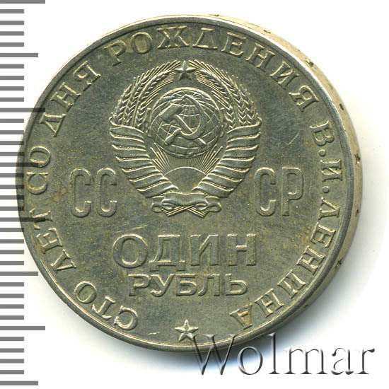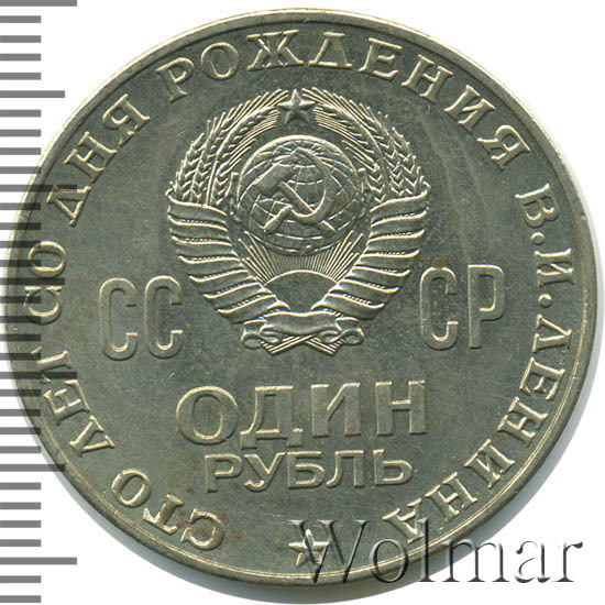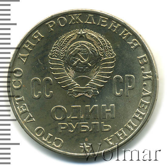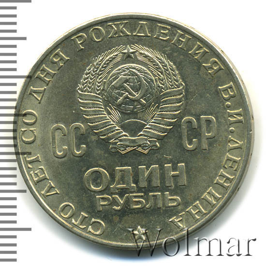 Слева, сверху и справа вдоль края монеты слова «СТО ЛЕТ СО ДНЯ РОЖДЕНИЯ В.И. ЛЕНИНА», в центре герб СССР с 15 витками ленты, слева от него буквы «СС», справа «СР», ниже обозначение достоинства монеты «ОДИН» и ниже слово «РУБЛЬ», внизу у края монеты пятиконечная звезда.