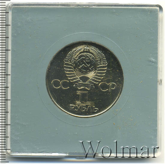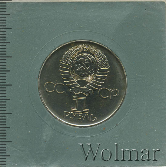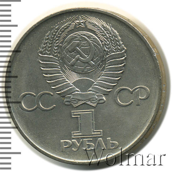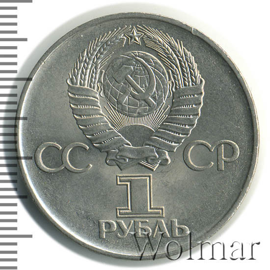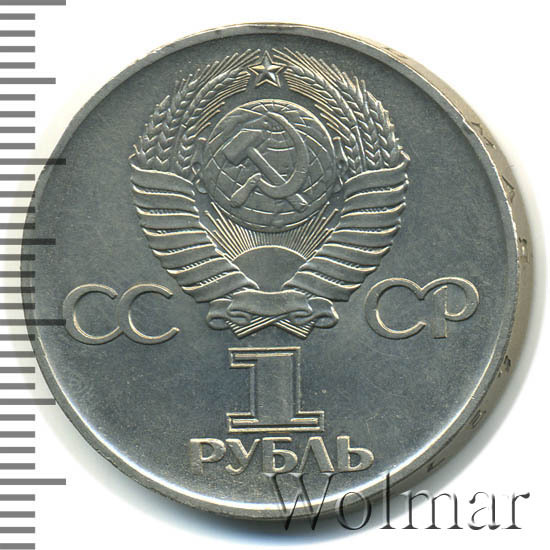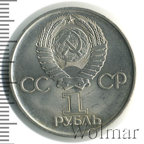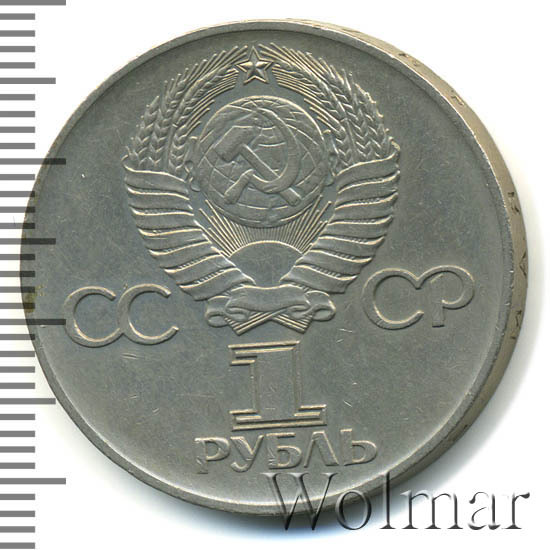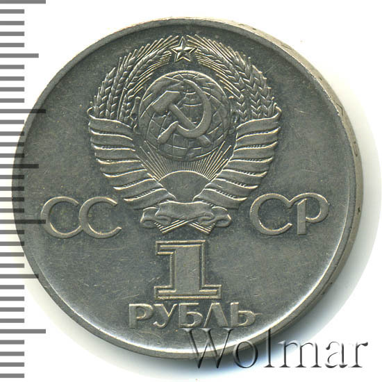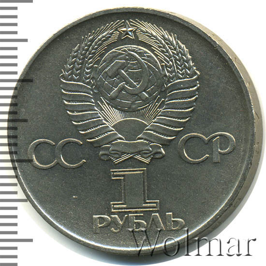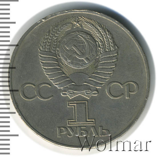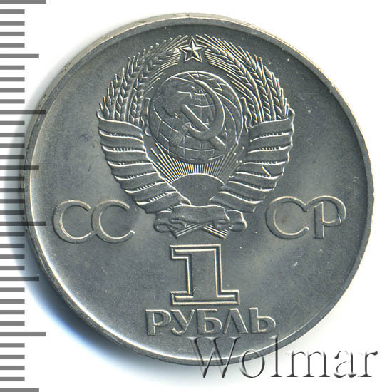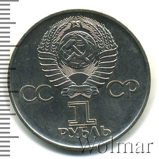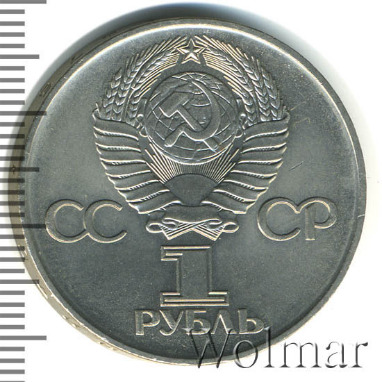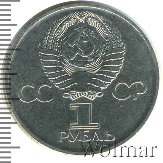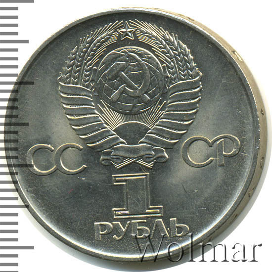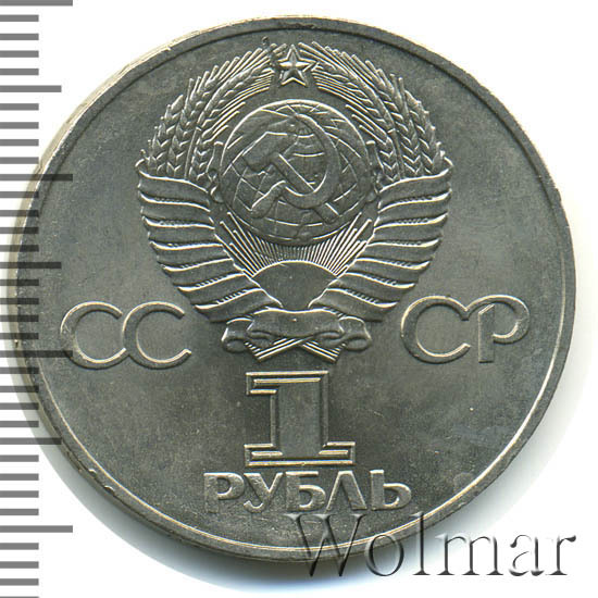 Сверху герб СССР с 15 витками ленты, слева от него буквы «СС», справа «СР», ниже обозначение достоинства монеты цифра «1» и ниже слово «РУБЛЬ».