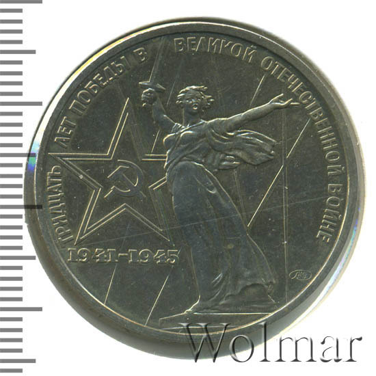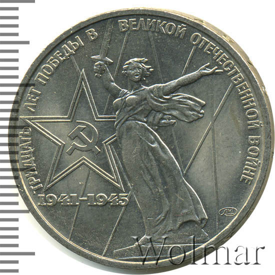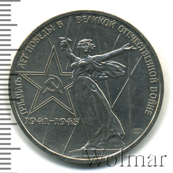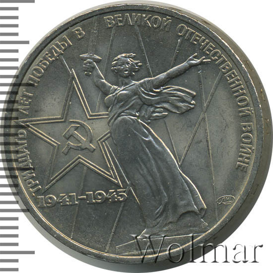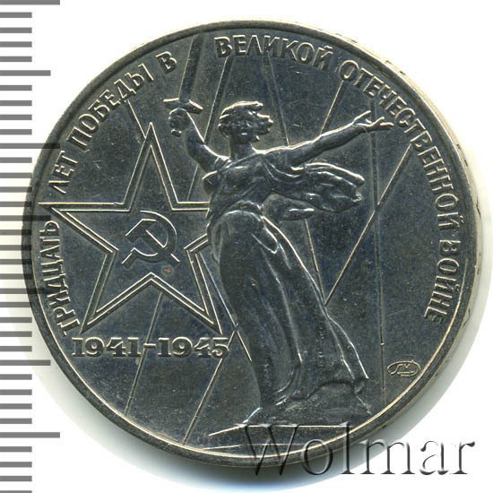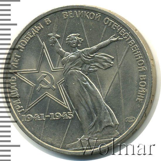 К 30 летней годовщине победы в Великой Отечественной Войне были отчеканены юбилейные рубли в количестве около 16 млн. экземпляров, 1 млн. из которых был изготовлен в улучшенном качестве по технологии Proof. Позднее в 1988 году, специально для коллекционеров были дополнительно выпущены, так называемые, новоделы (55 тысяч штук), отличающиеся от оригинальных монет (proof) дополнительной надписью на гурте "1988" и буквой "Н".