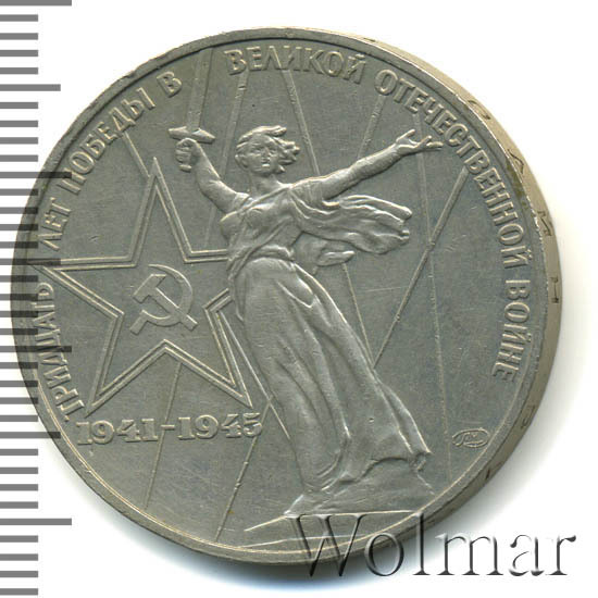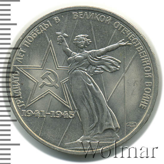 В центре изображение скульптуры Е. В. Вучетича «Родина-Мать» из памятника - ансамбля героям Сталинградской битвы в Волгограде, Слева от скульптуры пятиконечная звезда с серпом и молотом в центре, под звездой цифры «1941-1945». Звезда и скульптура расположены на фоне шести лучей прожекторов, изображающих цифру «XXX». По кругу надпись «ТРИДЦАТЬ ЛЕТ ПОБЕДЫ В ВЕЛИКОЙ ОТЕЧЕСТВЕННОЙ ВОЙНЕ». Ниже окончания круговой надписи монограмма Ленинградского монетного двора.