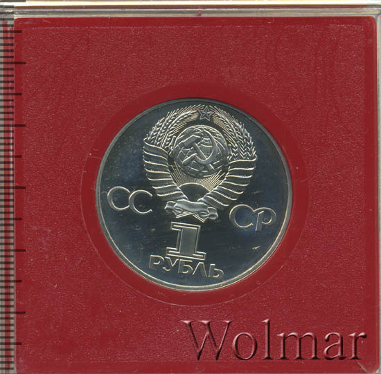 Сверху герб СССР с 15 витками ленты, слева от него буквы «СС», справа «СР», ниже обозначение достоинства монеты цифра «1» и ниже слово «РУБЛЬ».