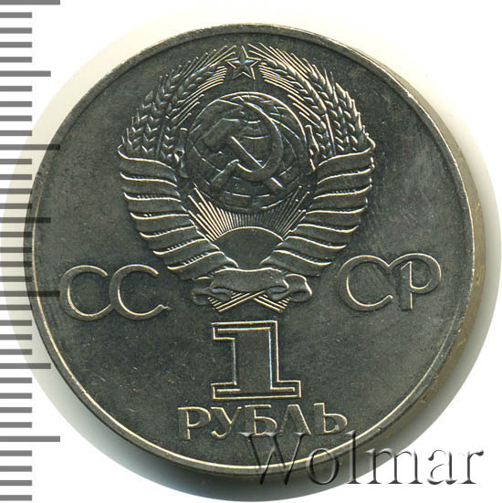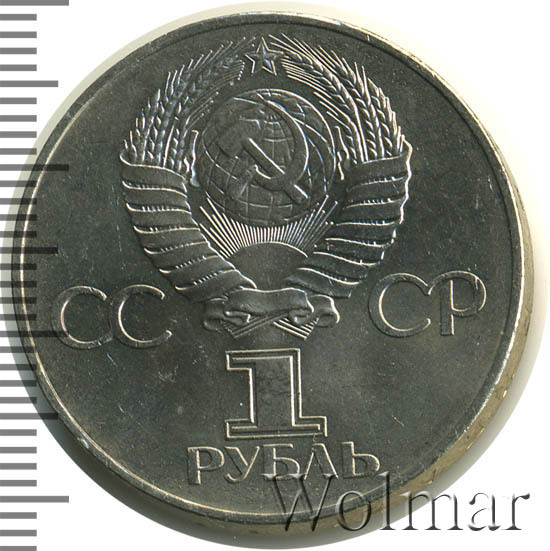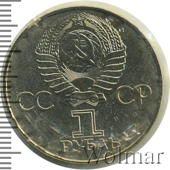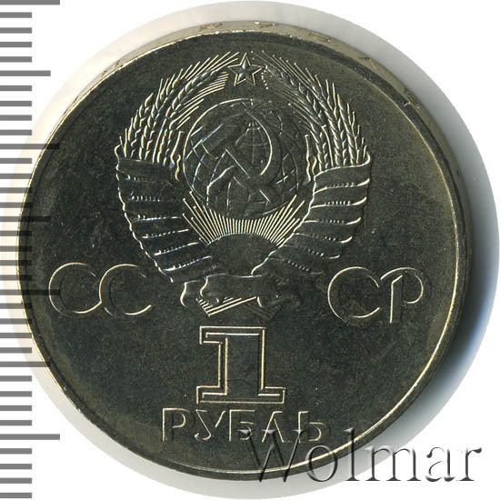 Сверху герб СССР с 15 витками ленты, слева от него буквы «СС», справа «СР», ниже обозначение достоинства монеты цифра «1» и ниже слово «РУБЛЬ».