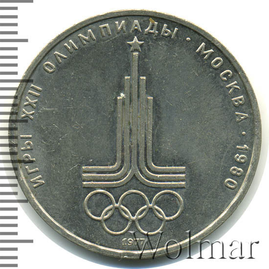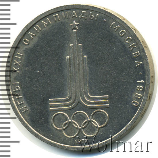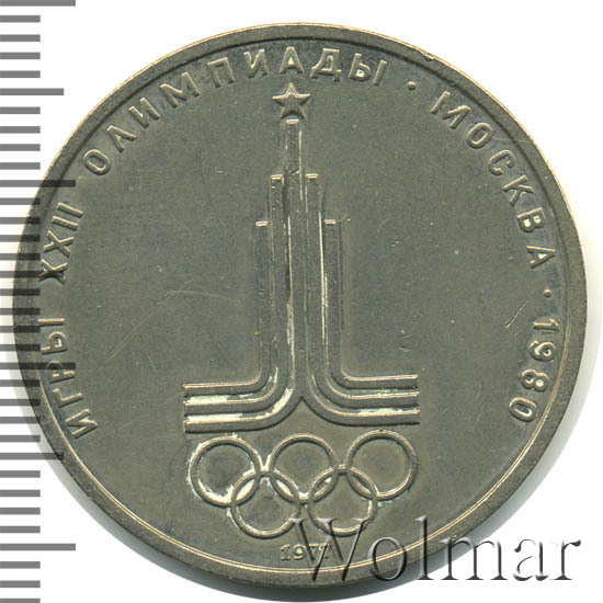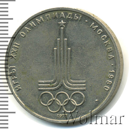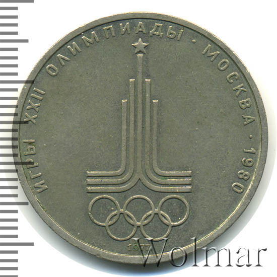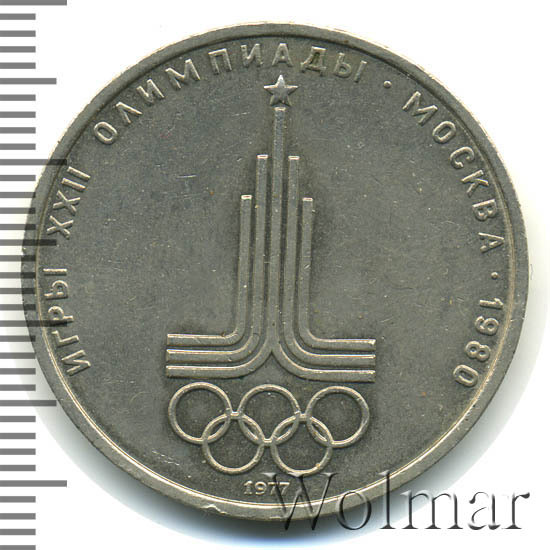 В 1977 в преддверии Олимпиады Госбанком СССР была выпущена первая памятная монета с эмблемой игр. Тираж юбилейного рубля составил порядка 9 миллионов экземпляров, 300 тысяч из которых, было отчеканено улучшенным качеством proof. На реверсе монеты находится стилизованное изображение Спасской башни Кремля из параллельных линий, символизирующих спортивные дорожки, увенчанные пятиконечной звёздочкой. Под линиями - традиционный символ олимпийских игр - пять переплетённых колец, олицетворяющие соревнования спортсменов с пяти континентов мира.