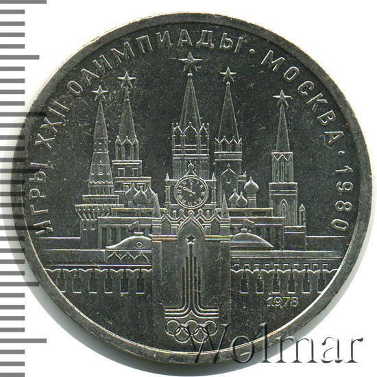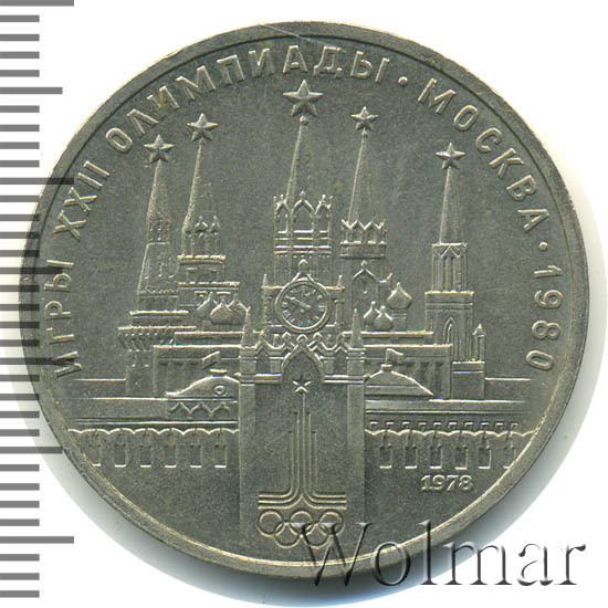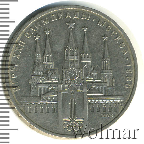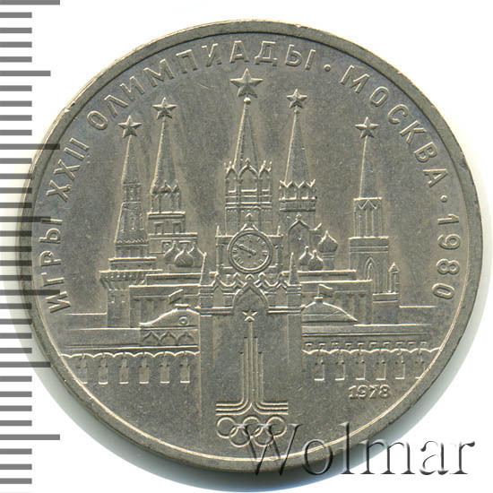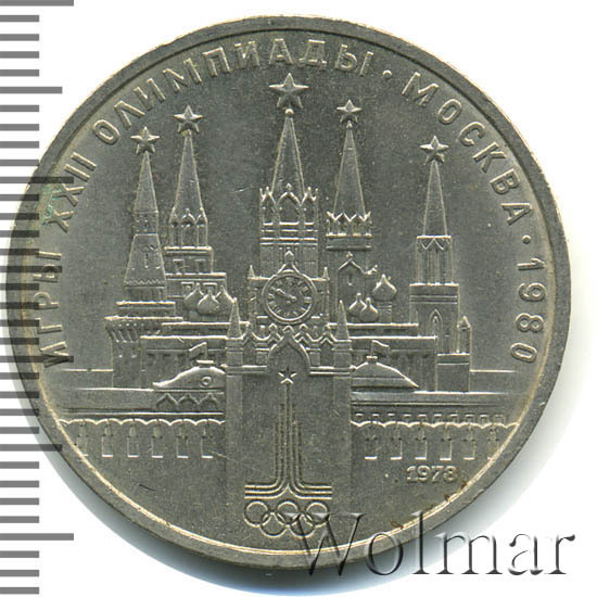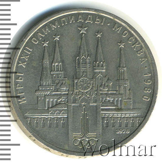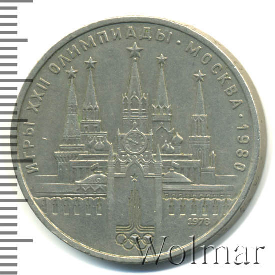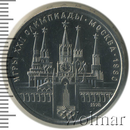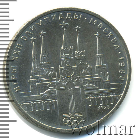 В центре изображение Спасской башни Московского Кремля. Слева за Кремлевской стеной дворец и две башни: Водовзводная и Боровицкая, справа дворец и башни: Троицкая и Никольская. В нижней части эмблема Олимпийских игр 1980 г., справа дата «1978», обозначающая год чеканки. По окружности надпись «ИГРЫ XXII ОЛИМПИАДЫ - МОСКВА - 1980».