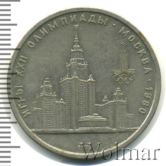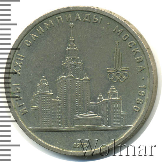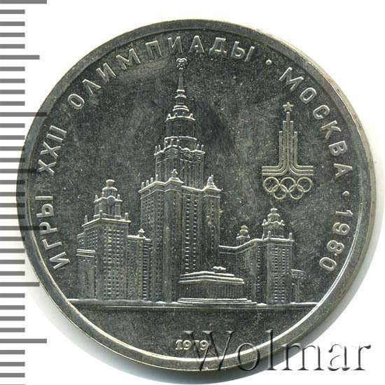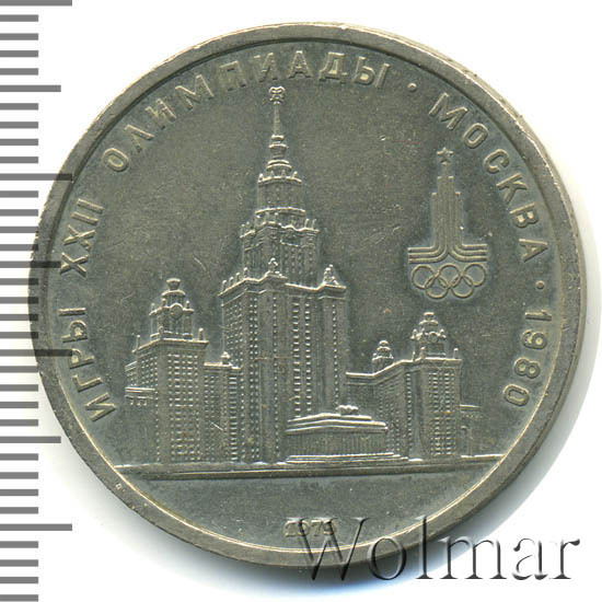 В центре изображение здания Московского государственного университета им. М.В. Ломоносова, под ним дата «1979», обозначающая год чеканки. Справа вверху эмблема Олимпийских игр 1980 г. По окружности надпись «ИГРЫ XXII ОЛИМПИАДЫ - МОСКВА - 1980».
