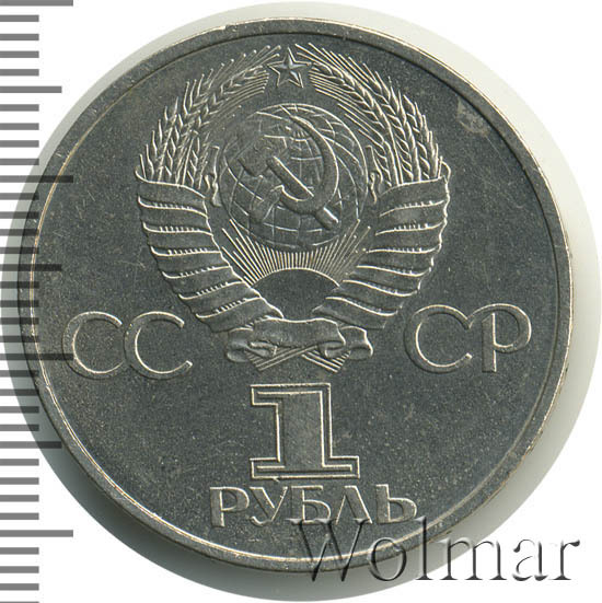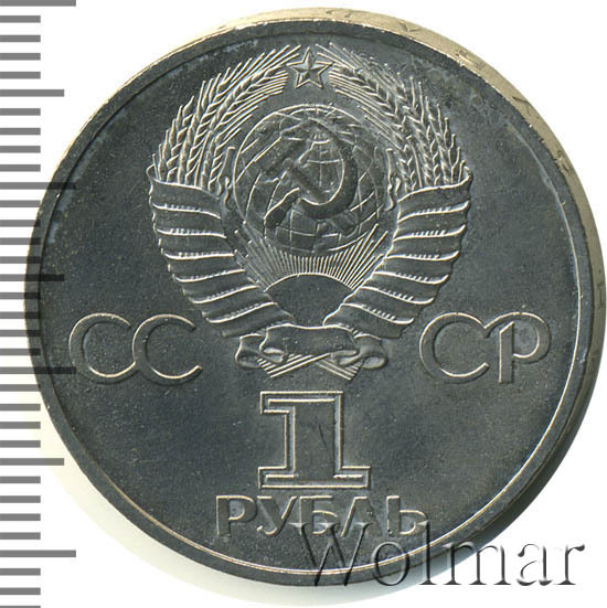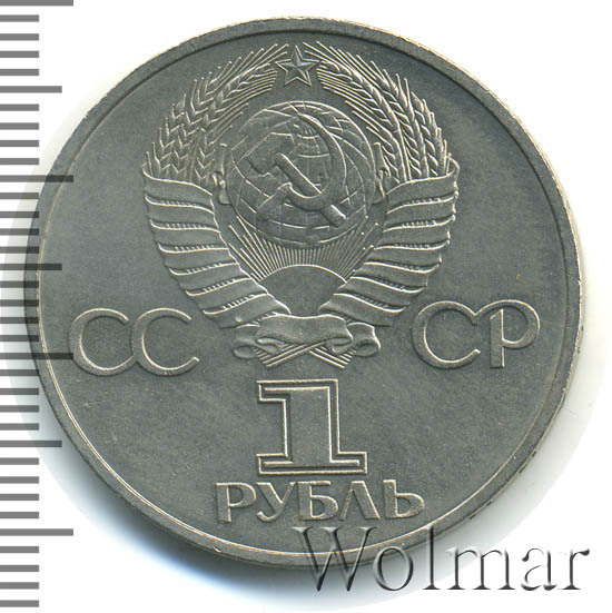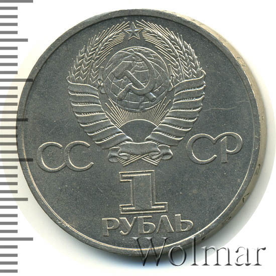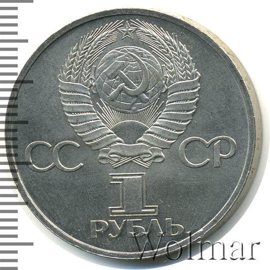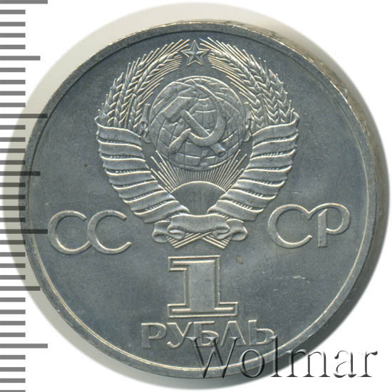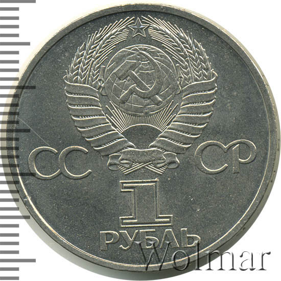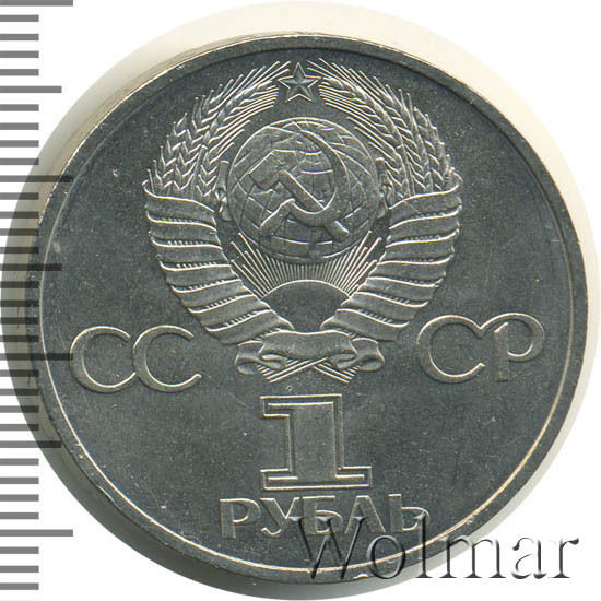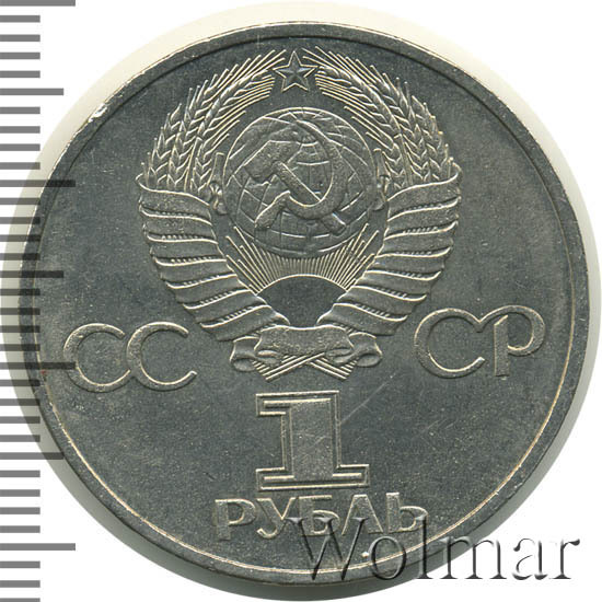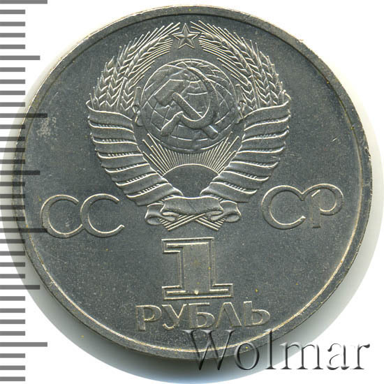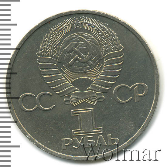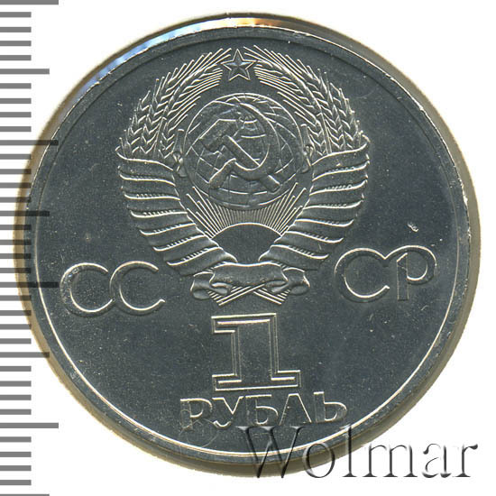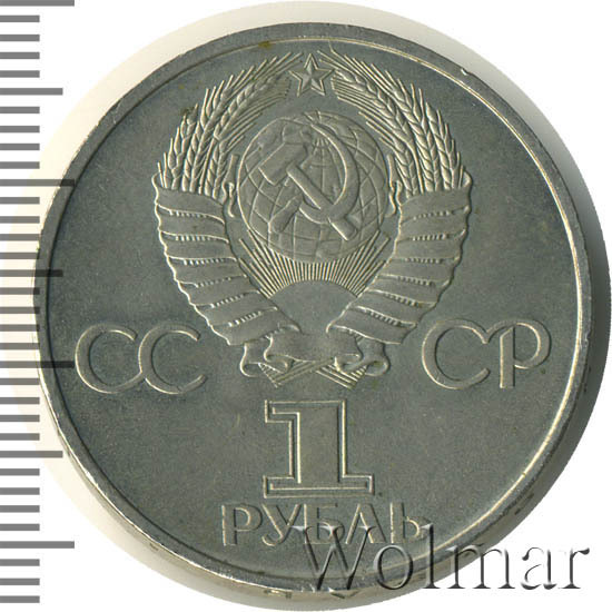 Сверху герб СССР с 15 витками ленты, слева от него буквы «СС», справа «СР», ниже обозначение достоинства монеты цифра «1» и ниже слово «РУБЛЬ».