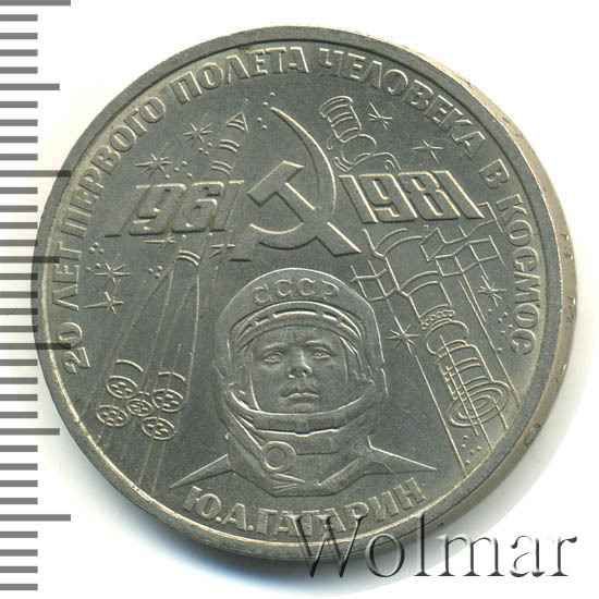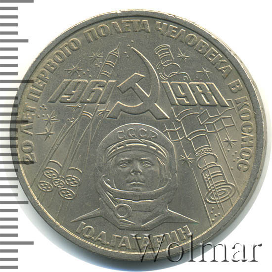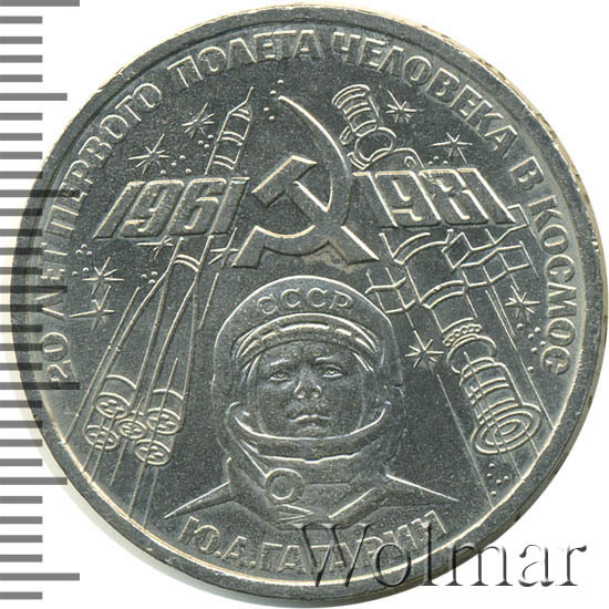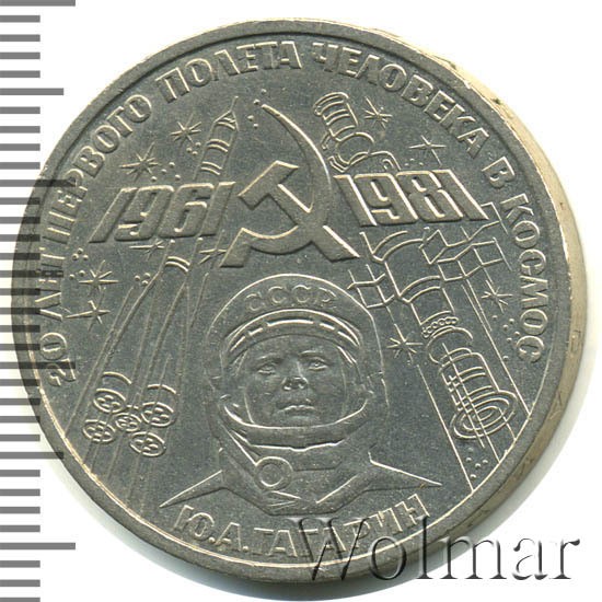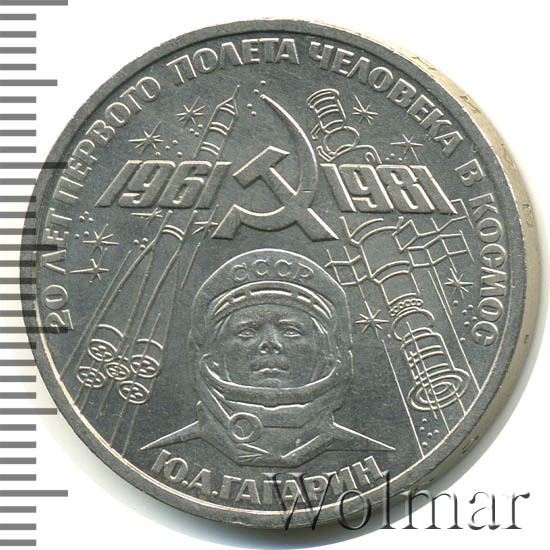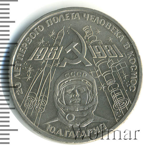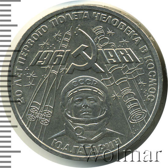 В одна тысяча девятьсот восемьдесят первом году, был продолжен выпуск серии юбилейных и памятных монет, посвященных знаменательным датам в истории нашего государства. На Ленинградском монетном дворе была выпущена в обращение приятная монета, номиналом в 1 рубль, в ознаменование двадцатилетия первого полёта человека в космос – гражданина СССР Ю.А.Гагарина. Свои первые шаги в авиации Гагарин сделал, будучи студентом техникума, который окончил в 1955 г., а уже в 1960 году, как один из наиболее талантливых летчиков – истребителей, был зачислен в отряд космонавтов.