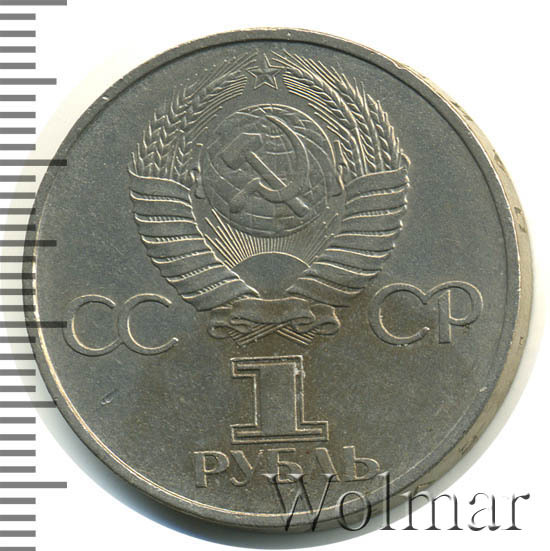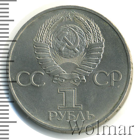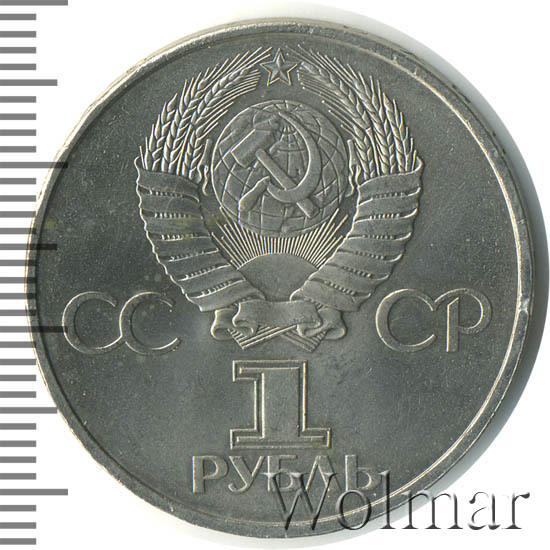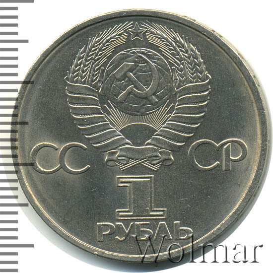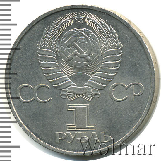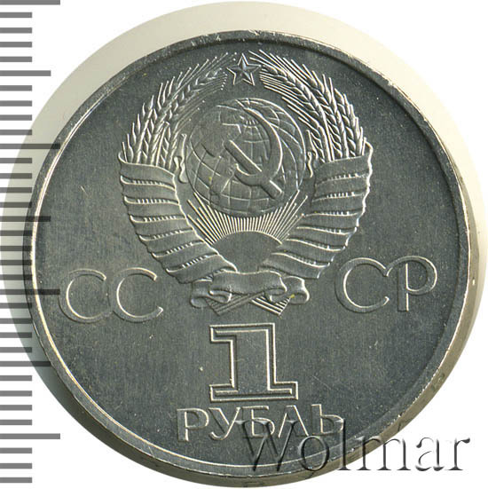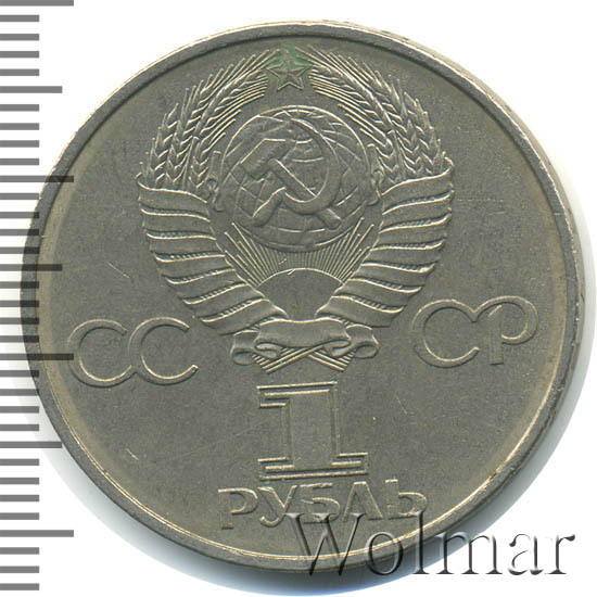 Сверху герб СССР с 15 витками ленты, слева от него буквы «СС», справа «СР», ниже обозначение достоинства монеты цифра «1» и ниже слово «РУБЛЬ».