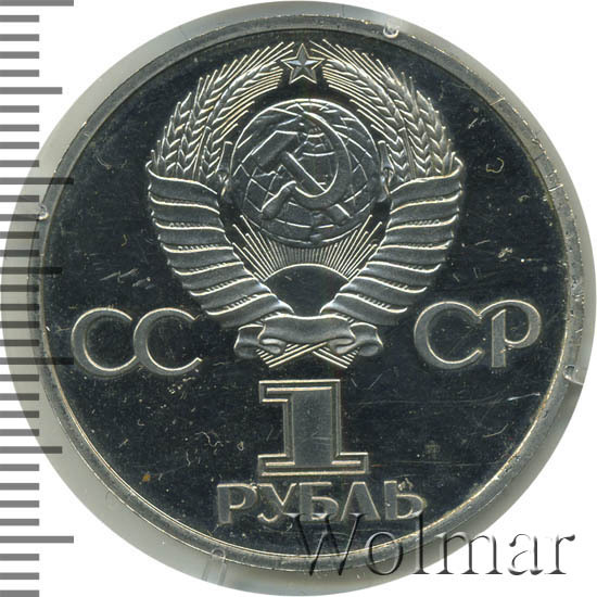 Сверху герб СССР с 15 витками ленты, слева от него буквы «СС», справа «СР», ниже обозначение достоинства монеты цифра «1» и ниже слово «РУБЛЬ».