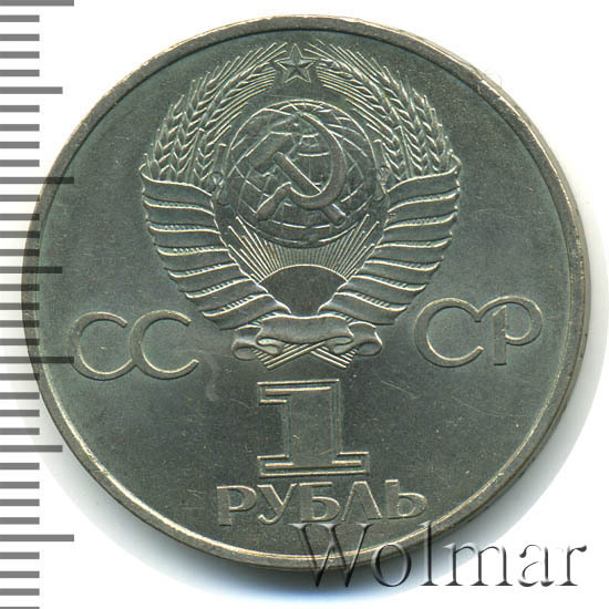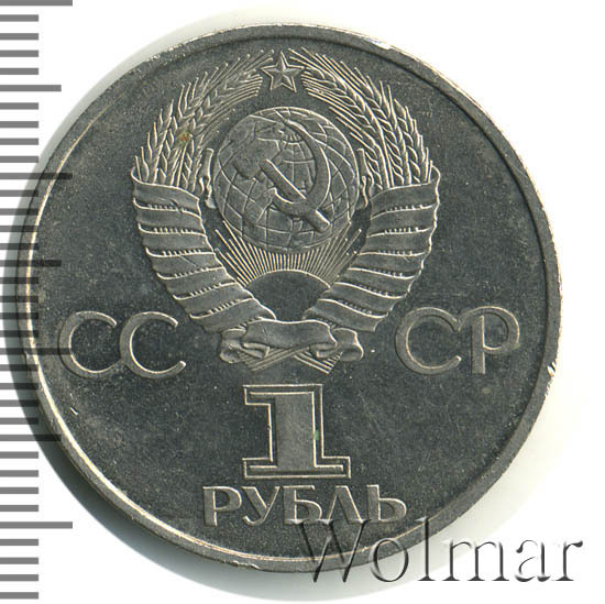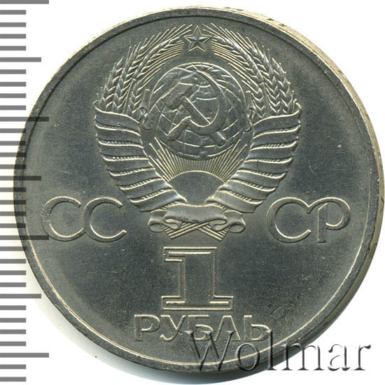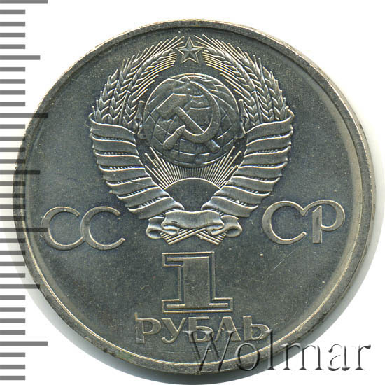 Сверху герб СССР с 15 витками ленты, слева от него буквы «СС», справа «СР», ниже обозначение достоинства монеты цифра «1» и ниже слово «РУБЛЬ».
