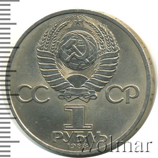 Сверху герб СССР с 15 витками ленты, слева от него буквы «СС», справа «СР», ниже обозначение достоинства монеты цифра «1» и ниже слово «РУБЛЬ», внизу у канта год выпуска монеты «1983».