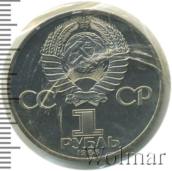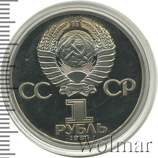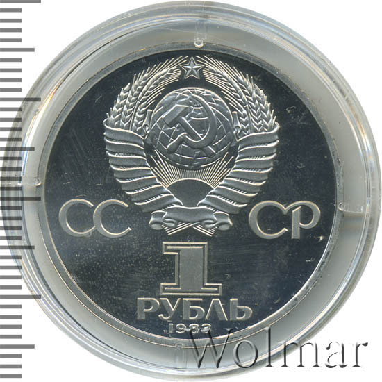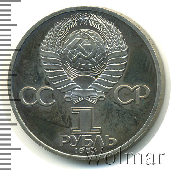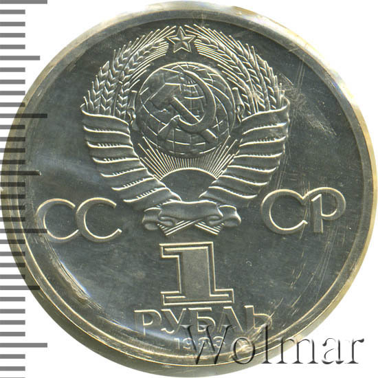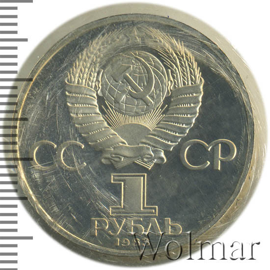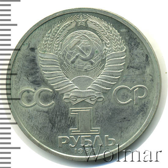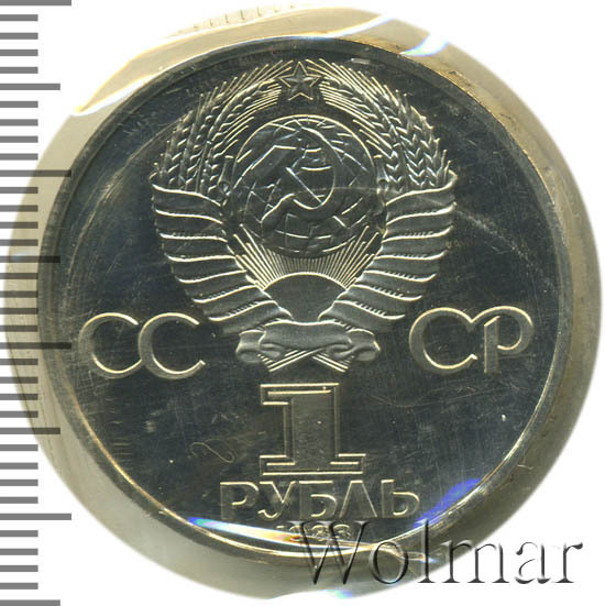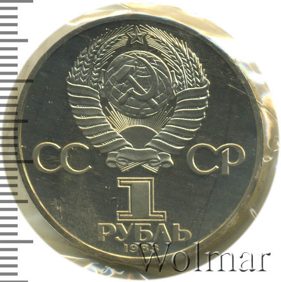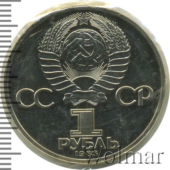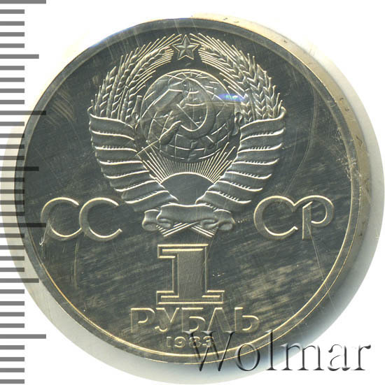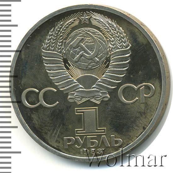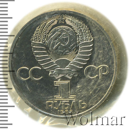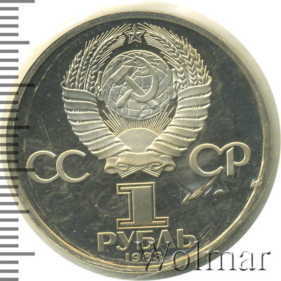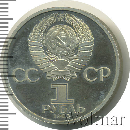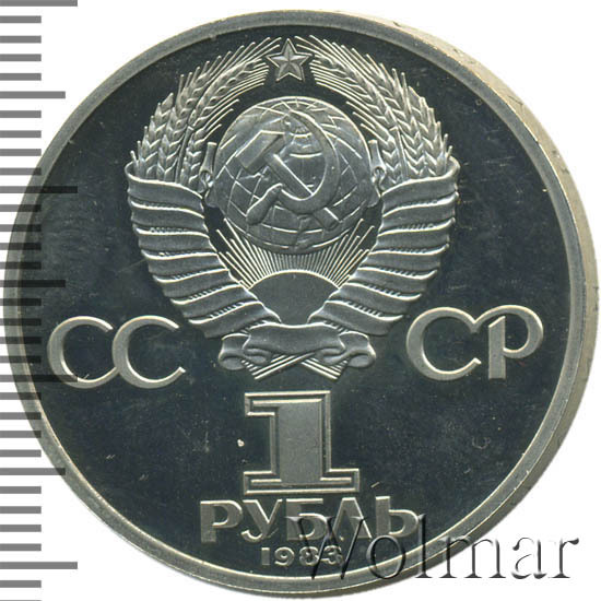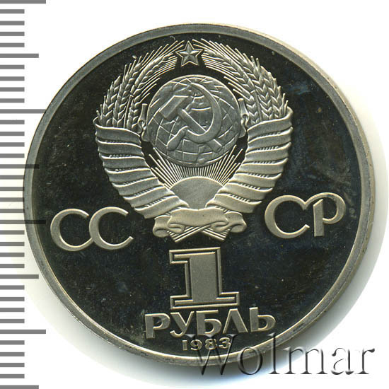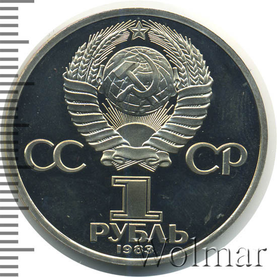 Сверху герб СССР с 15 витками ленты, слева от него буквы «СС», справа «СР», ниже обозначение достоинства монеты цифра «1» и ниже слово «РУБЛЬ», внизу у канта год выпуска монеты «1983».