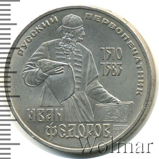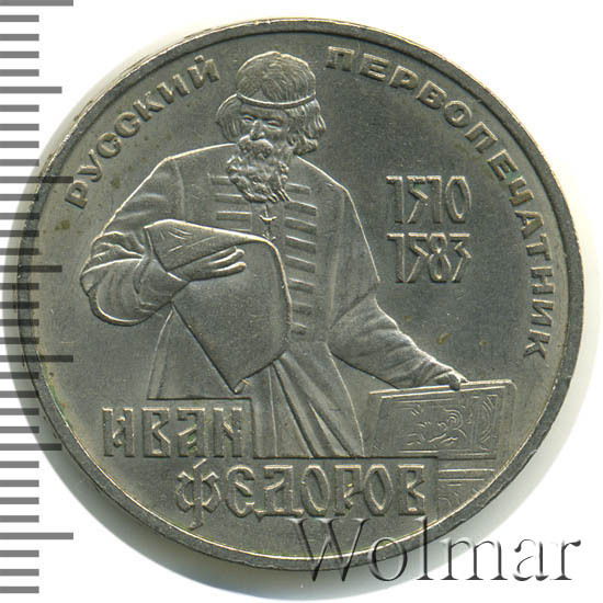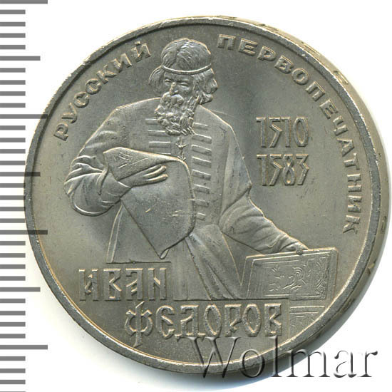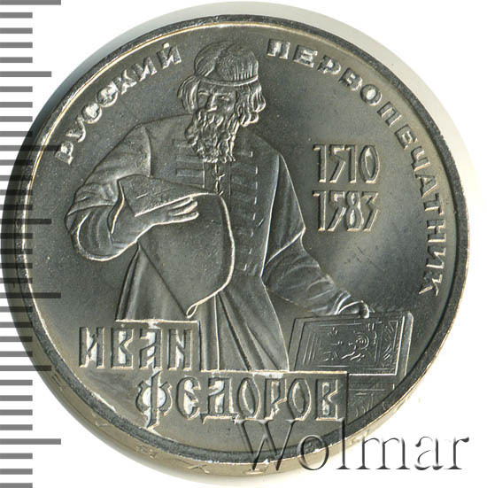 В 1983 году, мировая общественность торжественно отметила четырёхсотлетие со дня смерти Ивана Фёдорова. В Советском Союзе, к этой дате, была выпущена памятная монета, номиналом в 1 рубль. Чеканка производилась на Ленинградском монетном дворе. Медно – никелевый монетный сплав, немагнитный, белого цвета. Расположение сторон монеты (аверса к реверсу) – медальное.