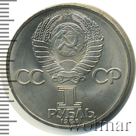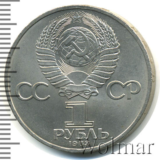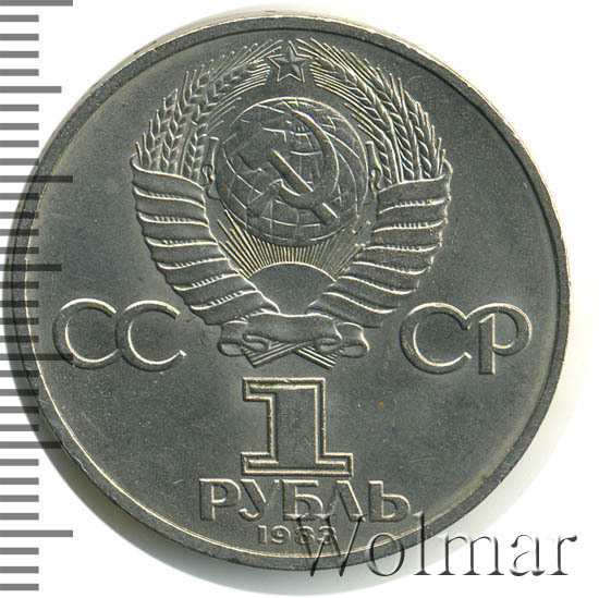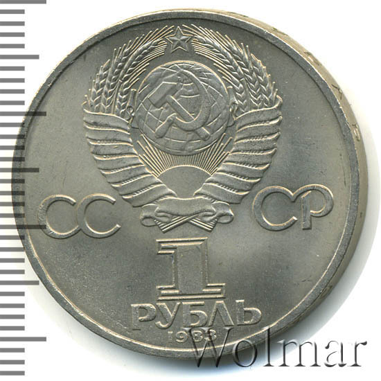Сверху герб СССР с 15 витками ленты, слева от него буквы «СС», справа «СР», ниже обозначение достоинства монеты цифра «1» и ниже слово «РУБЛЬ», внизу у канта год чеканки монеты «1983».