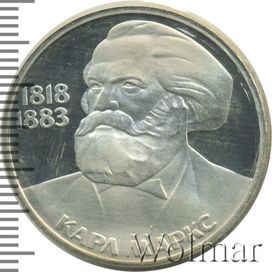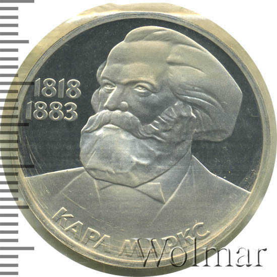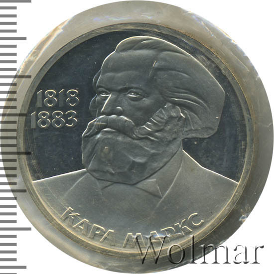 Новодельный (повторный) выпуск памятной монеты Советского Союза, достоинством в один рубль, выпущенной в 1983 году, в связи со ста шестидесяти пятилетием со дня рождения Карла Маркса и столетием со дня его смерти. Технология чеканки монет - proof – like. Дата выпуска: 1988 год. Всего было выпущено 19 новодельных монет, памятных и юбилейных рублей 1965 – 1986 годов. Вновь отчеканенные (новодельные) рубли, это монеты, отчеканенные подлинными или вновь изготовленными штемпелями, специально для коллекционеров.