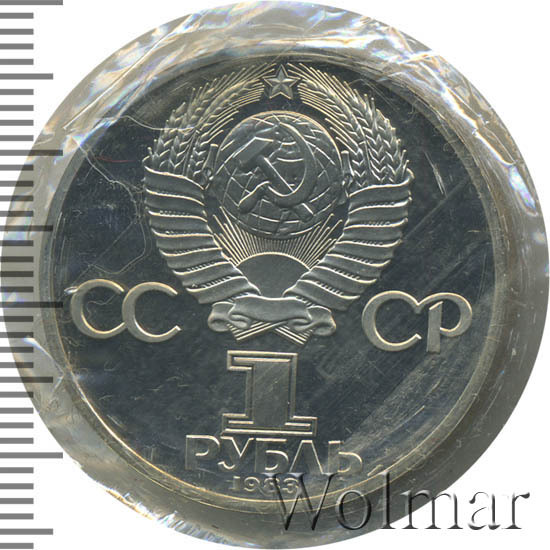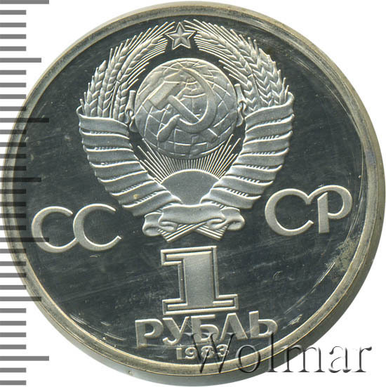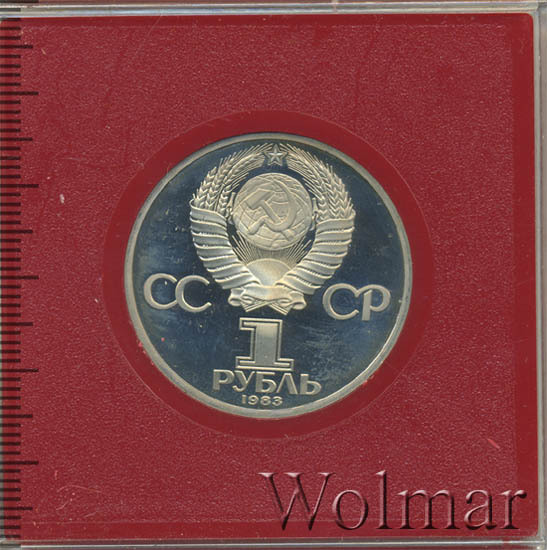 Сверху герб СССР с 15 витками ленты, слева от него буквы «СС», справа «СР», ниже обозначение достоинства монеты цифра «1» и ниже слово «РУБЛЬ», внизу у канта год выпуска монеты «1983».