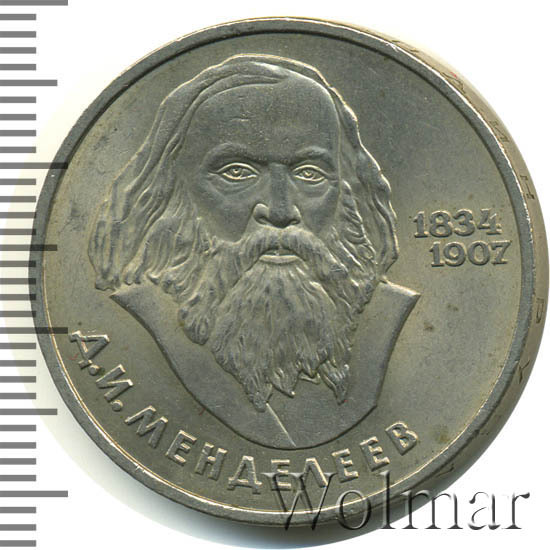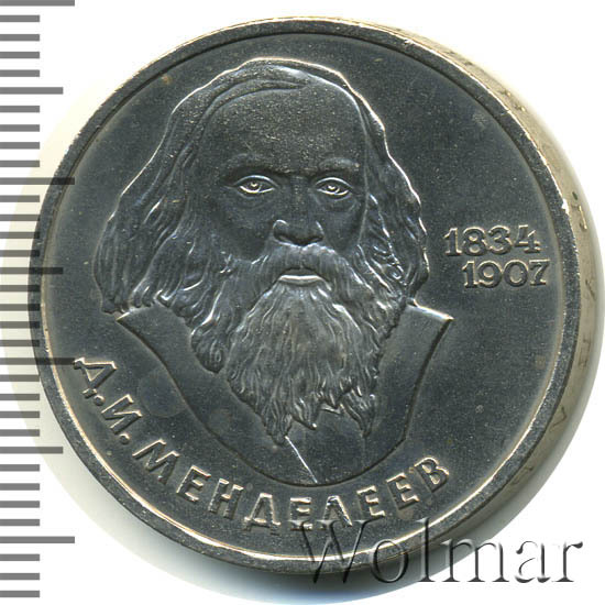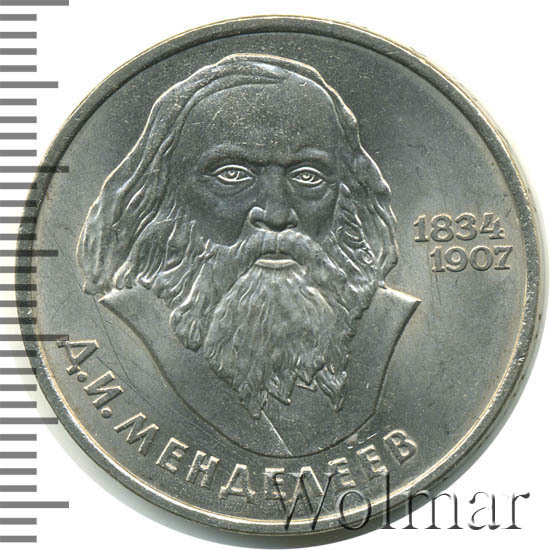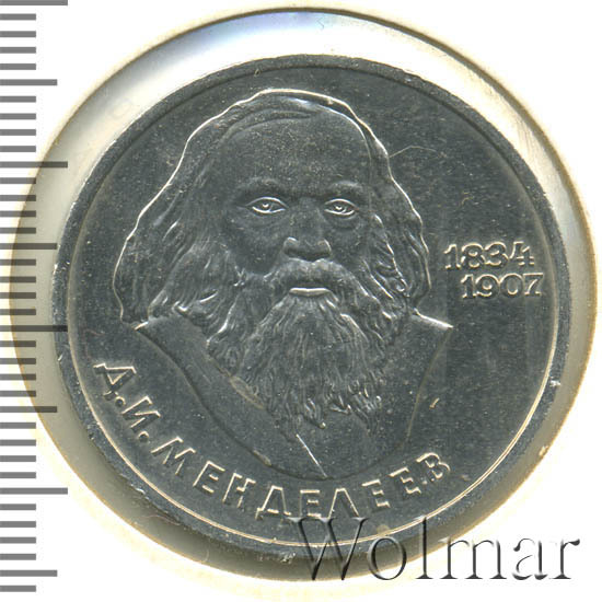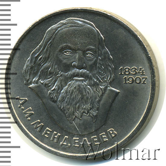 Памятная монета, выпущенная в обращение в связи со 150 – летием со дня рождения Дмитрия Ивановича Менделеева. Лицевая сторона рубля: погрудное изображение великого учёного. Справа даты рождения (1834) и смерти (1907). В нижней части надпись Д.И. Менделеев. Великий химик, разносторонний учёный, гений научной мысли, педагог и общественный деятель – Д.М. Менделеев родился 27.01.1834 года в городе Тобольске. Выпущена монета на Ленинградском монетном дворе (ЛМД) в количестве двух миллионов штук, из них - 35000 в качестве Proof. Стоимость этого памятного рубля не большая, слишком большой тираж. О цене можно говорить только о монете в превосходном состоянии.