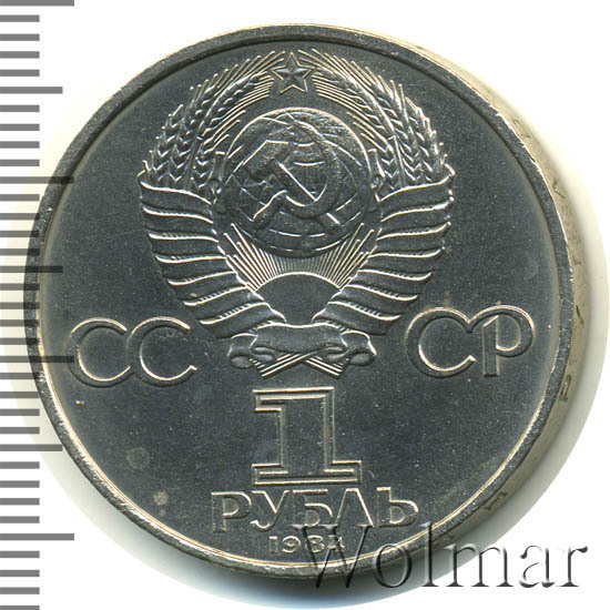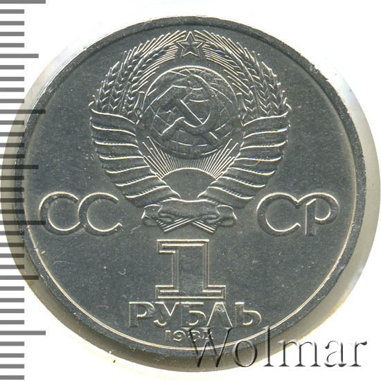 Сверху герб СССР с 15 витками ленты, слева от него буквы «СС», справа «СР», ниже обозначение достоинства монеты цифра «1» и ниже слово «РУБЛЬ», внизу у канта год выпуска монеты «1984».