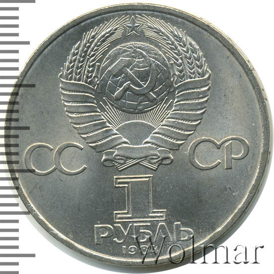 | Гурт | две вдавленные надписи «ОДИН РУБЛЬ», между ними две вдавленные квадратные точки. |