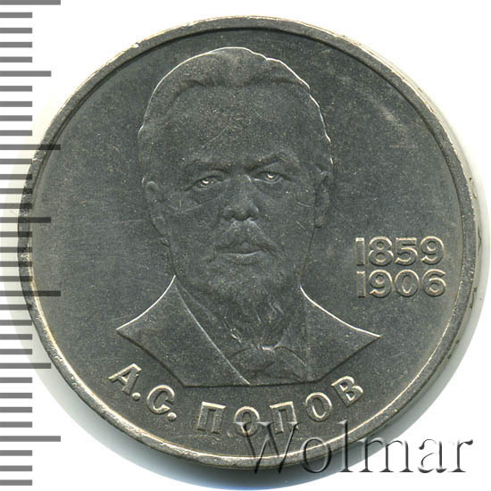 Российский физик и электротехник, изобретатель безпроводной связи – радио и радиосвязи. Памятная монета, выпущенная в обращение в связи со 150 – летием со дня рождения Александра Степановича Попова. Седьмого мая (по новому стилю) сделал доклад о достигнутых им результатах по передачи электромагнитных волн на расстояния. Теперь этот день считается Днём Радио. Характеристики 1 рубля 1984 А.С. Попов: медно – никелевый сплав, белого цвета, масса 12,8 грамм, диаметр 31 мм. Чеканка Ленинградского монетного двора. Цена на этот рубль не велика в отличие от этого же рубля, произведённого в качестве Proof. О стоимости можно говорить только о монете в превосходном состоянии.В 1988 был произведён повторный (новодельный) выпуск данного рубля, с той же датой. Если в Вашей коллекции юбилейных монет Советского Союза, эта монета ненадлежащего качества, и Вы хотите его улучшить, посмотрите страницу ниже, где даны результаты последних проходов по которым Вы можете узнать актуальную стоимость этого рубля 1984 года выпуска.