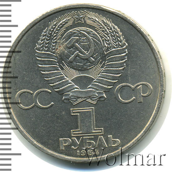 Сверху герб СССР с 15 витками ленты, слева от него буквы «СС», справа «СР», ниже обозначение достоинства монеты цифра «1» и ниже слово «РУБЛЬ», внизу у канта год выпуска монеты «1984».