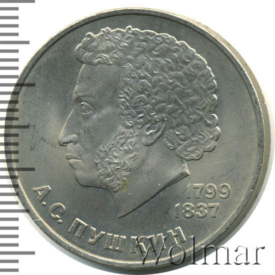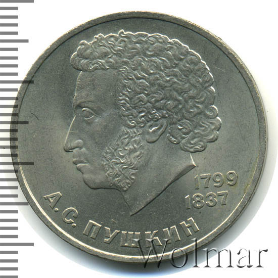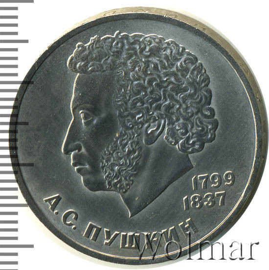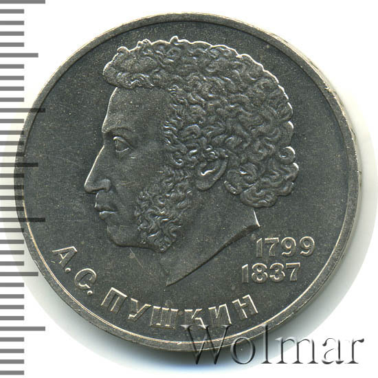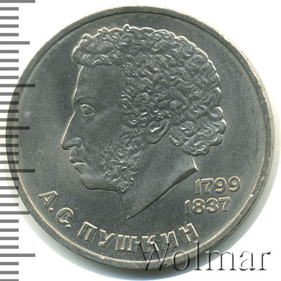 Государственным Банком СССР, в одна тысяча восемьдесят четвёртом году, был продолжен выпуск серии юбилейных и памятных монет, посвященных видным деятелям науки и искусства, живших в нашей стране. Юбилейный рубль с изображением на лицевой стороне монеты профиля Пушкина, был отчеканен на ЛМД в связи со ста восьмидесяти пятилетием со дня рождения этого великого поэта. Александр Сергеевич родился шестого июня (по новому стилю) 1799 года, в семье потомка старинного боярского рода. Его поэма « Руслан и Людмила» знаменовала начало перелома в русской поэзии. Данные о тираже и технические характеристики монеты, на странице ниже. Цена зависит от коллекционного состояния конкретного экземпляра. На монетном дворе, также были отчеканены, небольшим тиражом, 1 рубль Пушкин "стародел" , по улучшенной технологии Пруф. Цена, на "староделы" в восемь раз выше цены на этот рубль обычной чеканки. Если в Вашей коллекции юбилейных монет Советского Союза, эта монета ненадлежащего качества, посмотрите страницу ниже, где даны результаты последних проходов по которым Вы можете узнать актуальную стоимость одного рубля (Пушкин) 1984 года выпуска.