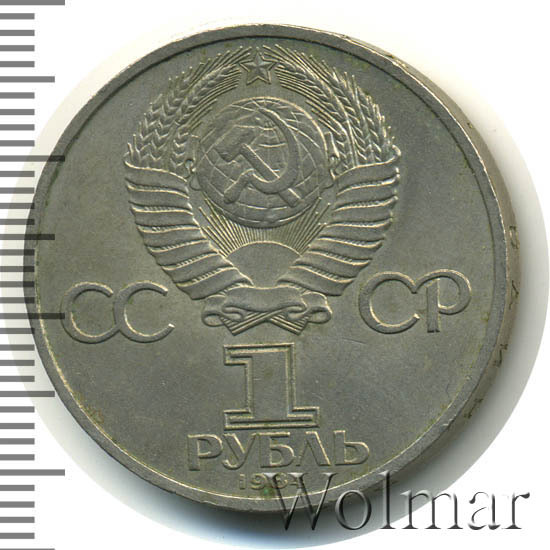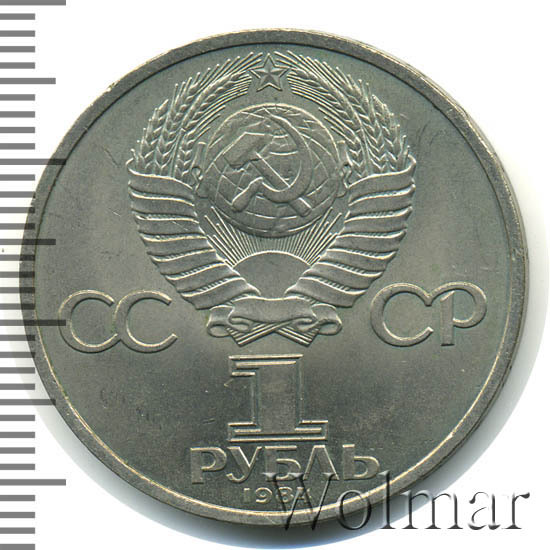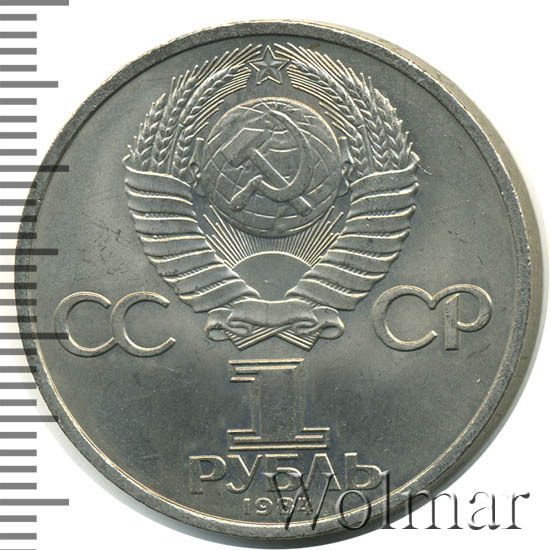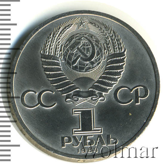 Сверху герб СССР с 15 витками ленты, слева от него буквы «СС», справа «СР», ниже обозначение достоинства монеты цифра «1» и ниже слово «РУБЛЬ», внизу у канта год выпуска монеты «1984».