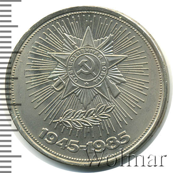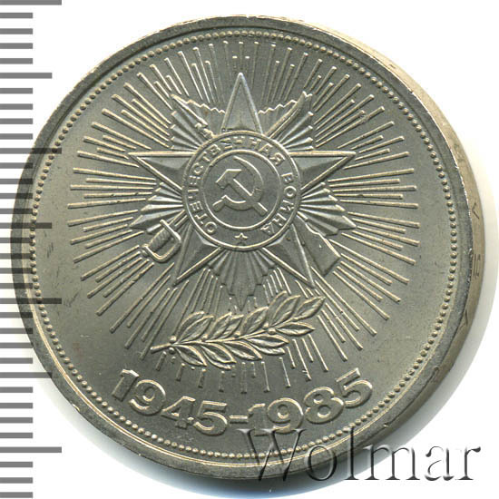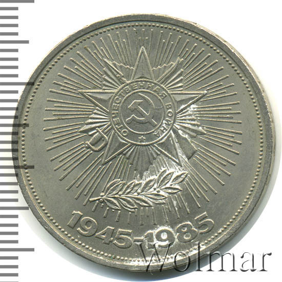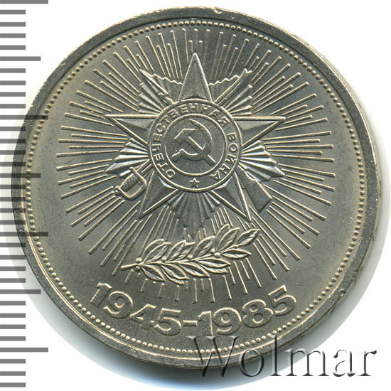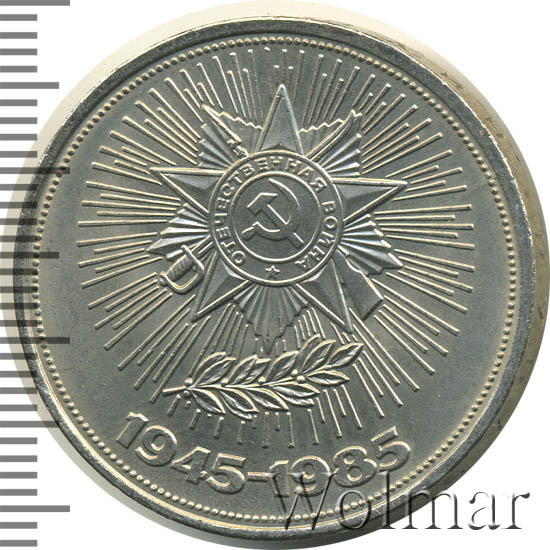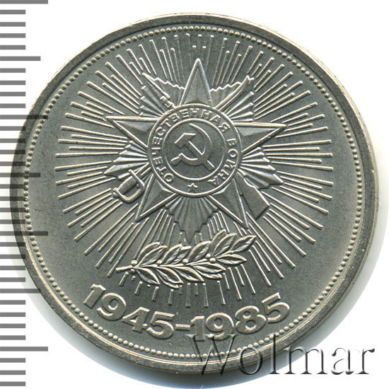 В 1985 году в честь 40 летия победы в Великой Отечественной Войне, была выпущена симпатичная юбилейная монета номиналом в 1 рубль. Он был изготовлен из традиционного немагнитного медно-никелевого сплава белого цвета. Тираж монеты составил порядка 6 миллионов экземпляров, 40 тысяч из которых были отчеканены улучшенным качеством Proof. Три года спустя, специально для коллекционеров были дополнительно выпущены, так называемые,новоделы (55 тысяч), отличающиеся от оригинальных монет (proof) дополнительной надписью на гурте "1988" и буквой "Н". На аверсе рубля, по обычаю, изображён герб страны - эмитента - Советского Союза, на реверсе - Орден Отечественной войны. Эта награда была учреждёна в мае 1942 года, став первым из орденов Великой Отечественной и имела две степени. Почётным Орденом за всё время было награждено более 1,2 млн. человек за стойкость, мужество и храбрость проявленное в боях с немецкими захватчиками.
