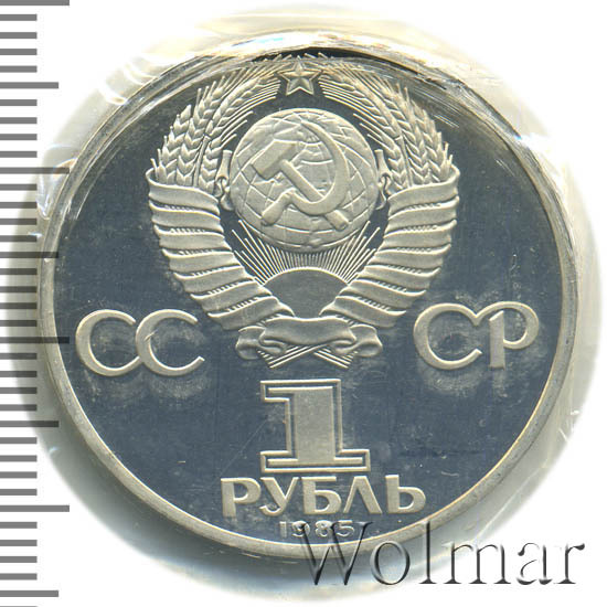 Сверху герб СССР с 15 витками ленты, слева от него буквы «СС», справа «СР», ниже обозначение достоинства монеты цифра «1» и ниже слово «РУБЛЬ», внизу у канта год выпуска монеты «1985».