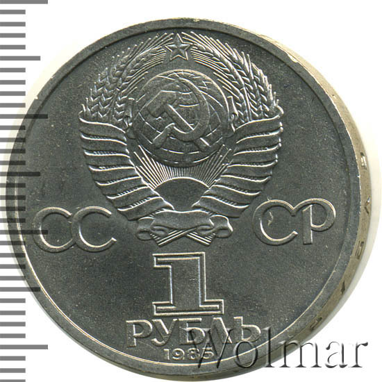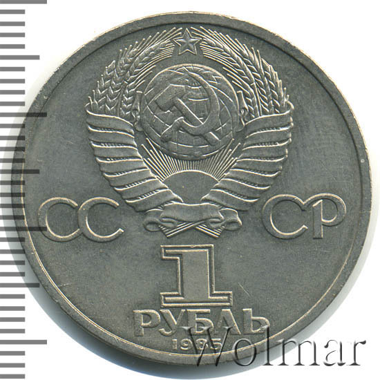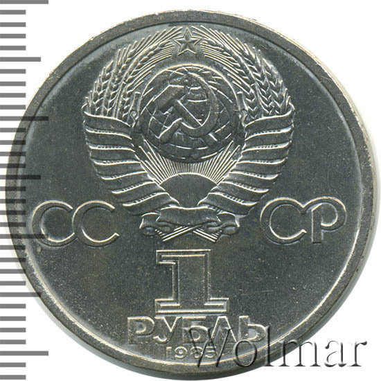 Сверху герб СССР с 15 витками ленты, слева от него буквы «СС», справа «СР», ниже обозначение достоинства монеты цифра «1» и ниже слово «РУБЛЬ», внизу у канта год выпуска монеты «1985».