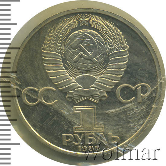 Сверху герб СССР с 15 витками ленты, слева от него буквы «СС», справа «СР», ниже обозначение достоинства монеты цифра «1» и ниже слово «РУБЛЬ», внизу у канта год выпуска монеты «1985».