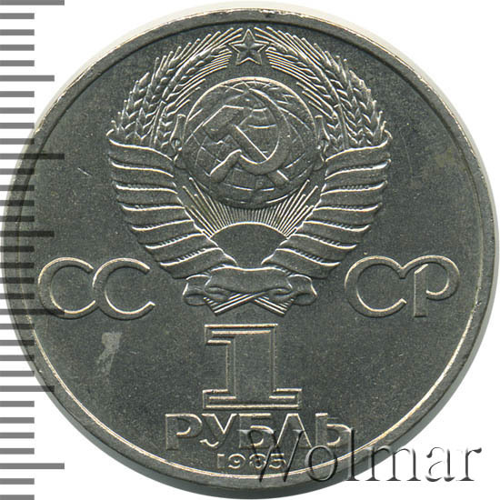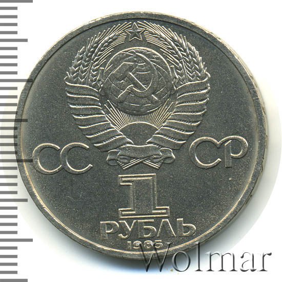 Сверху герб СССР с 15 витками ленты, слева от него буквы «СС», справа «СР», ниже обозначение достоинства монеты цифра «1» и ниже слово «РУБЛЬ», внизу у канта год выпуска монеты «1985».