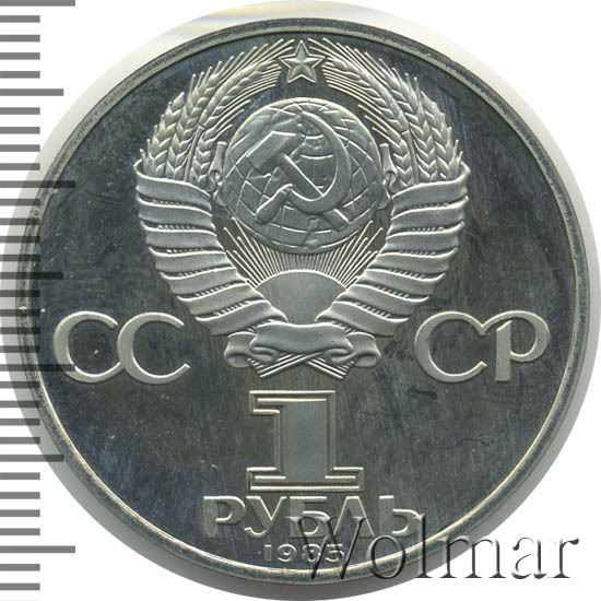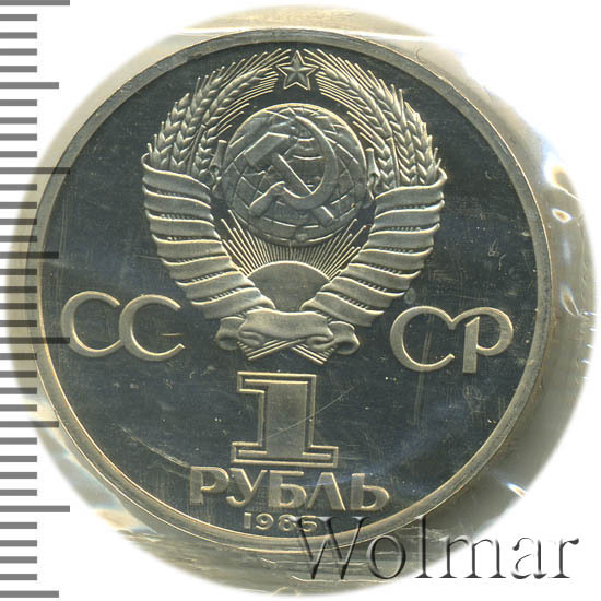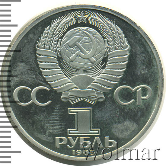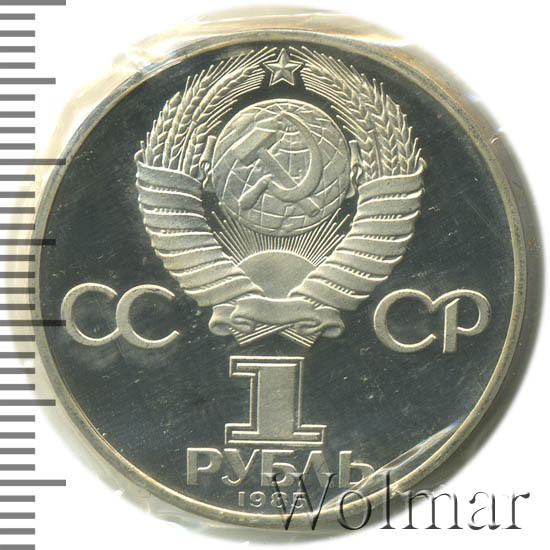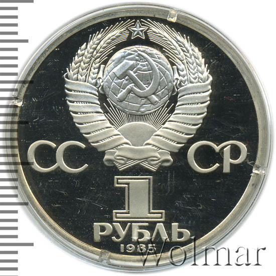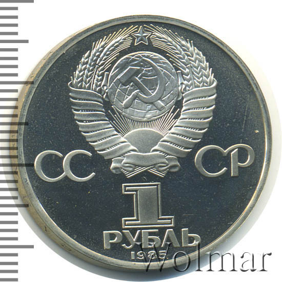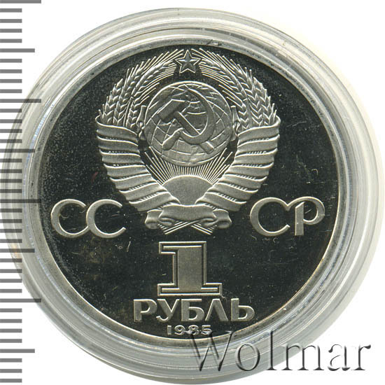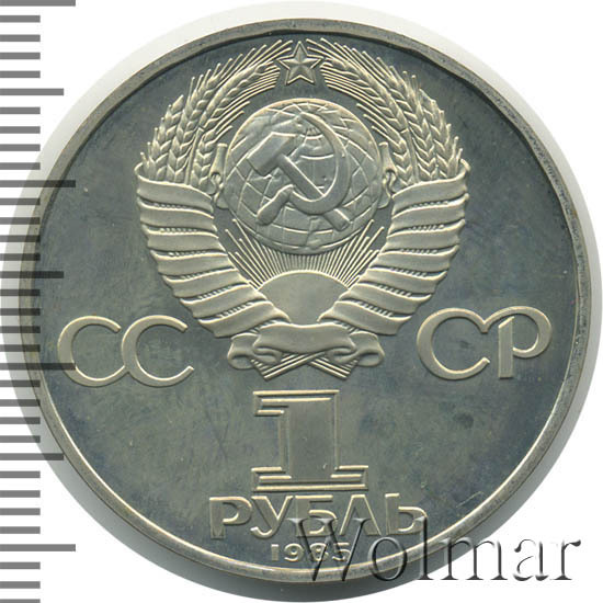 Сверху герб СССР с 15 витками ленты, слева от него буквы «СС», справа «СР», ниже обозначение достоинства монеты цифра «1» и ниже слово «РУБЛЬ», внизу у канта год выпуска монеты «1985».