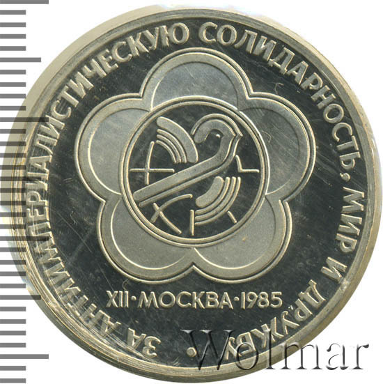 1 рубль 1985, посвященный всемирному фестивалю молодёжи, был изготовлен специально для коллекционеров в качестве Proof. Данная технология предполагает чеканку улучшенными полированными штемпелями на зеркальном поле монеты матового рельефа с высокой чёткостью самых мелких деталей рисунка. Эмблема фестиваля изображает контуры голубя мира в цветке с пятью лепестками, олицетворяющего пять континентов, авторства товарища Масаутова Р.З.