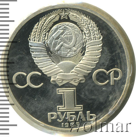 Сверху герб СССР с 15 витками ленты, слева от него буквы «СС», справа «СР», ниже обозначение достоинства монеты цифра «1» и ниже слово «РУБЛЬ», внизу у канта год выпуска монеты «1985».