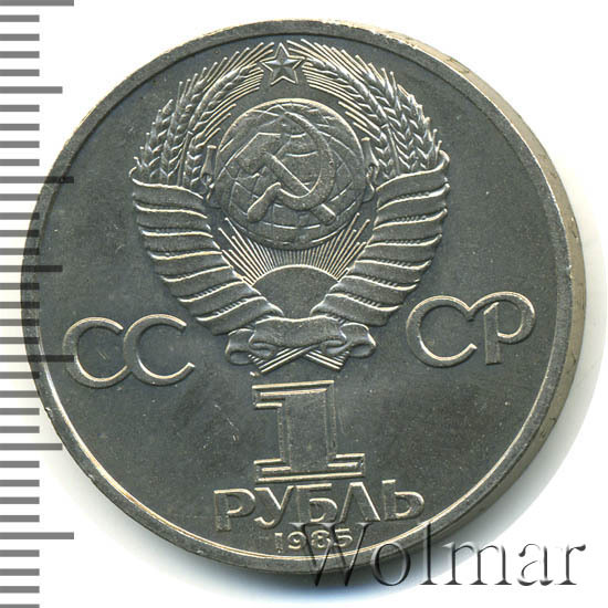 Сверху герб СССР с 15 витками ленты, слева от него буквы «СС», справа «СР», ниже обозначение достоинства монеты цифра «1» и ниже слово «РУБЛЬ», внизу у канта год выпуска монеты «1985».