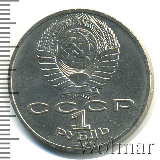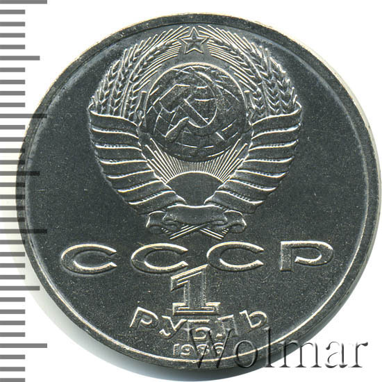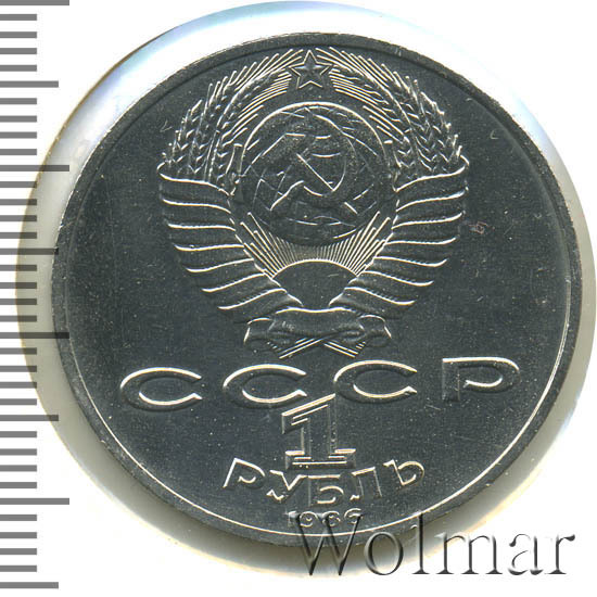 Сверху герб СССР с 15 витками ленты, под ним буквы «СССР», ниже обозначение достоинства монеты цифра «1» и ниже слово «РУБЛЬ», внизу у канта год выпуска монеты «1986».