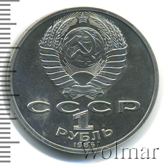 Сверху герб СССР с 15 витками ленты, под ним буквы «СССР», ниже обозначение достоинства монеты цифра «1» и ниже слово «РУБЛЬ», внизу у канта год выпуска монеты «1986».